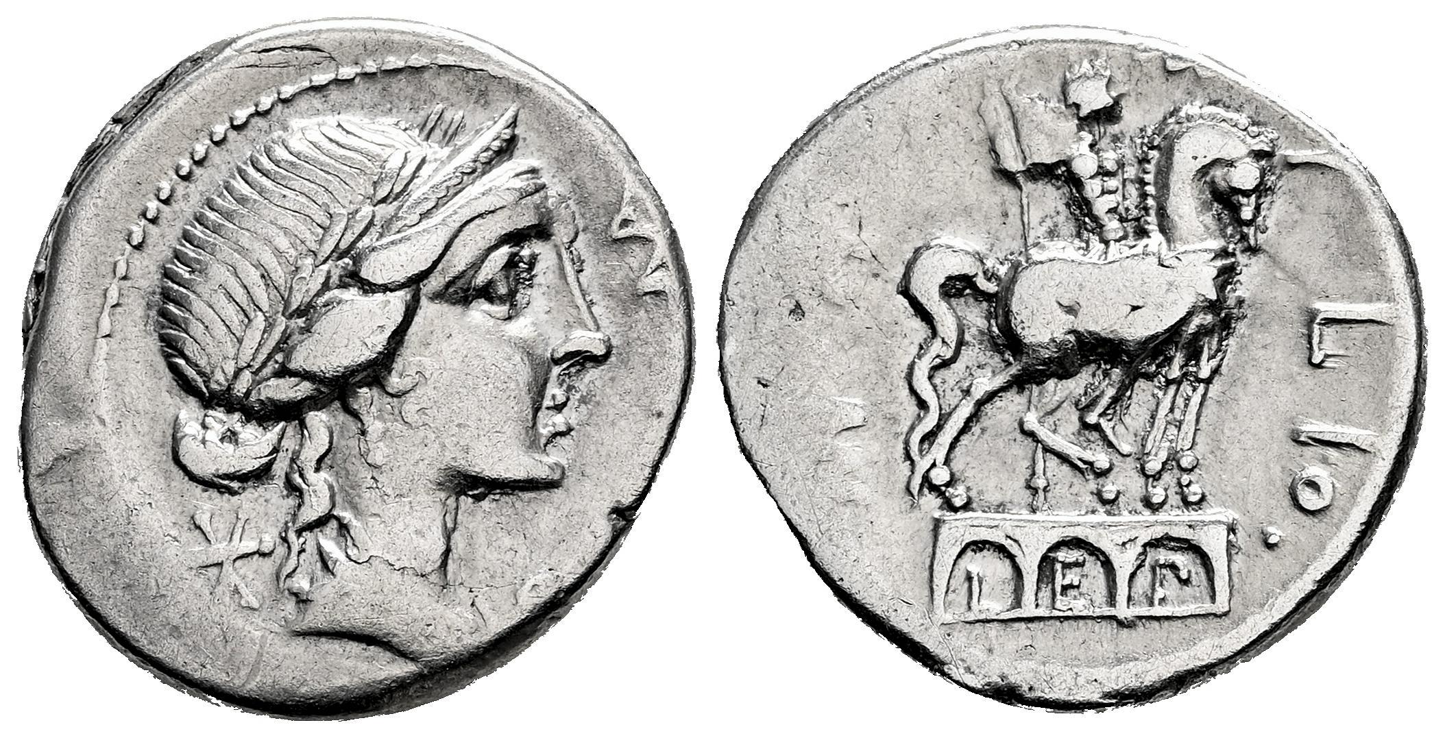 Aemilia. Man. Aemilius Lepidus. Denario. 114-113 a.C. Sur de Italia. (Ffc-103). (Craw-291/1). (Cal-73). Anv.: Cabeza laureada de Roma a derecha, detrás: X, delante: ROMA. (MA entrelazadas). Rev.: Estatua ecuestre a derecha sobre tres arcos: dentro de ellos LEP,en círculo. MN. AEMILIO (MN entrelazadas). Ag. 3,75 g. Ex Áureo & Calicó 394 (14/09/2022), lote 1033. MBC-. Est...100,00.