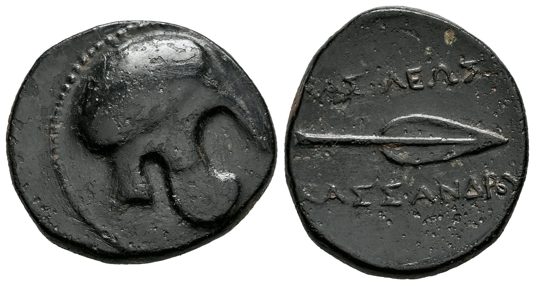 Reyes de Mauretania. Kassander. AE 20. 301-298/4 a.C. Ceca incierta en Caria. Acuñada bajo Pleistarchos. (Hgc-3, 998). Anv.: Casco a la derecha. Rev.: ΒAΣΙΛΕΩΣ - KAΣΣANΔPOY Punta de lanza a la derecha. Ae. 4,64 g. MBC/MBC+. Est...100,00.
