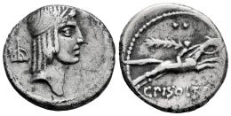 Calpurnia. C. Calpurnius Piso Frugi. Denario. 64 a.C. Roma. (Ffc-388). (Craw-340/1). (Cal-340b). Anv.: Cabeza laureada de Apolo a derecha, detrás de la cabeza símbolo. Rev.: Jinete con cabeza desnuda y palma, galopando a derecha, encima del jinete símbolo,C. PISO L.F. FRVG. Ag. 3,74 g. MBC/MBC-. Est...90,00.