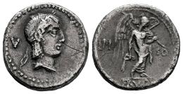 Calpurnia. L. Calpurnius Piso Frugi. Quinario. 90 a.C. Roma. (Craw-340/2e). (BMCRR Rome-2166). Anv.: Cabeza laureada de Apolo a la derecha; V (letra de control) detráscampos, FRVG(I) debajo. Rev.: Victoria en pie a la derecha, sosteniendo corona y rama de palma; L•PI-SO a través de los campos, FRVG(I) debajo. Ag. 1,92 g. Rayas. Escasa. MBC-. Est...90,00.