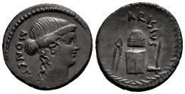 Carisia. T. Carisius. Denario. 46 a.C. Roma. (Ffc-543). (Craw-464/2). (Cal-382). Anv.: Cabeza de Juno Moneta a derecha, lleva dos mechones de pelo a lo largo de la nuca,detrás: MONETA. Rev.: Tenazas, yunque, cuño y martillo, encima: T. CARISIVS. Todo dentro de corona de laurel. Ag. 3,60 g. Pátina original. MBC/MBC+. Est...160,00.