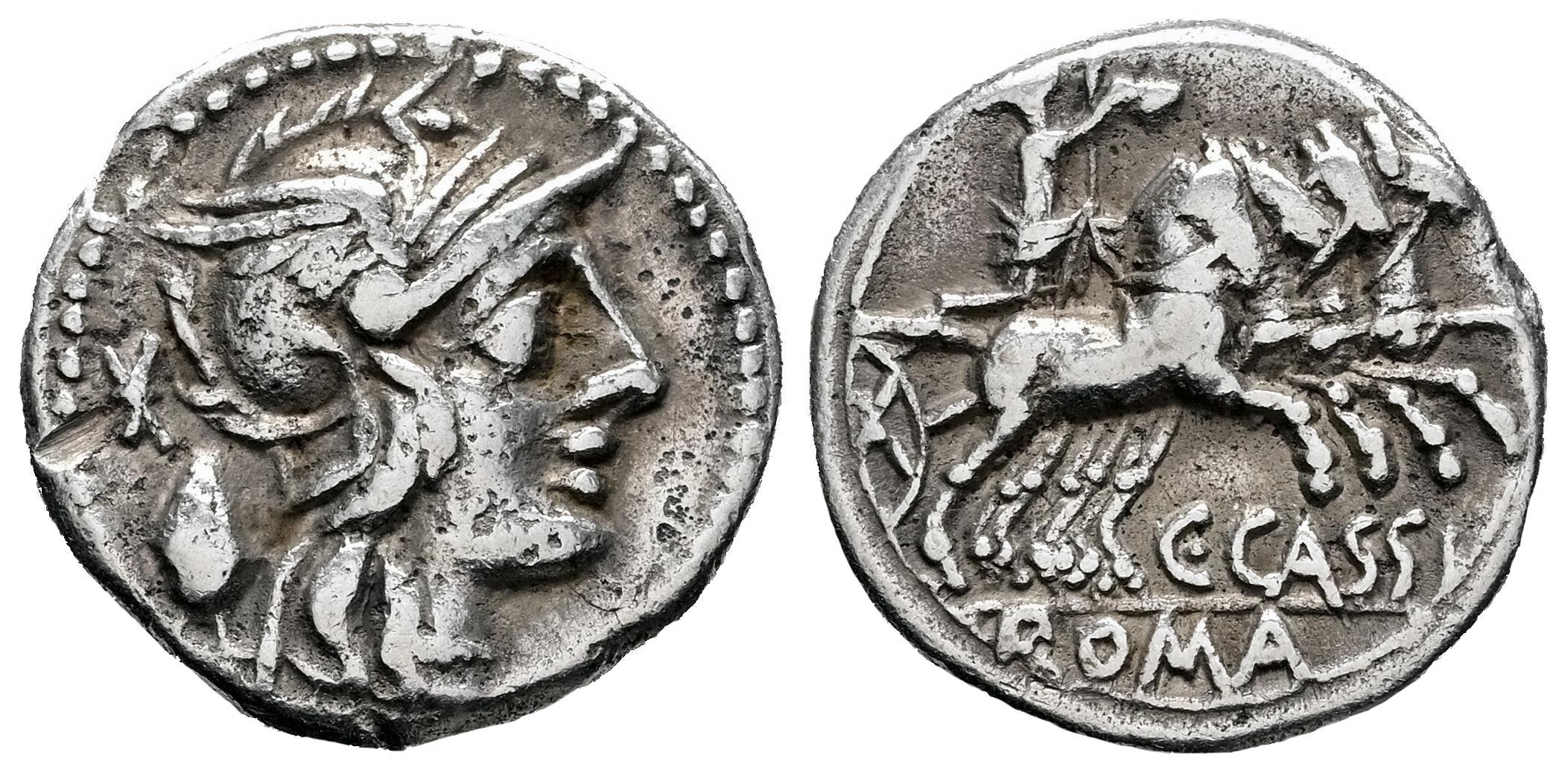Cassia. C. Cassius. Denario. 126 a.C. Roma. (Ffc-554). (Craw-266/1). (Cal-408). Anv.: Cabeza de Roma a derecha, detrás X sobre urna. Rev.: La Libertad en cuadriga a derecha, con cetro y gorro, debajo: C. CASSI., en el exergo: ROMA. Ag. 3,74 g. Limpiada. MBC-. Est...100,00.