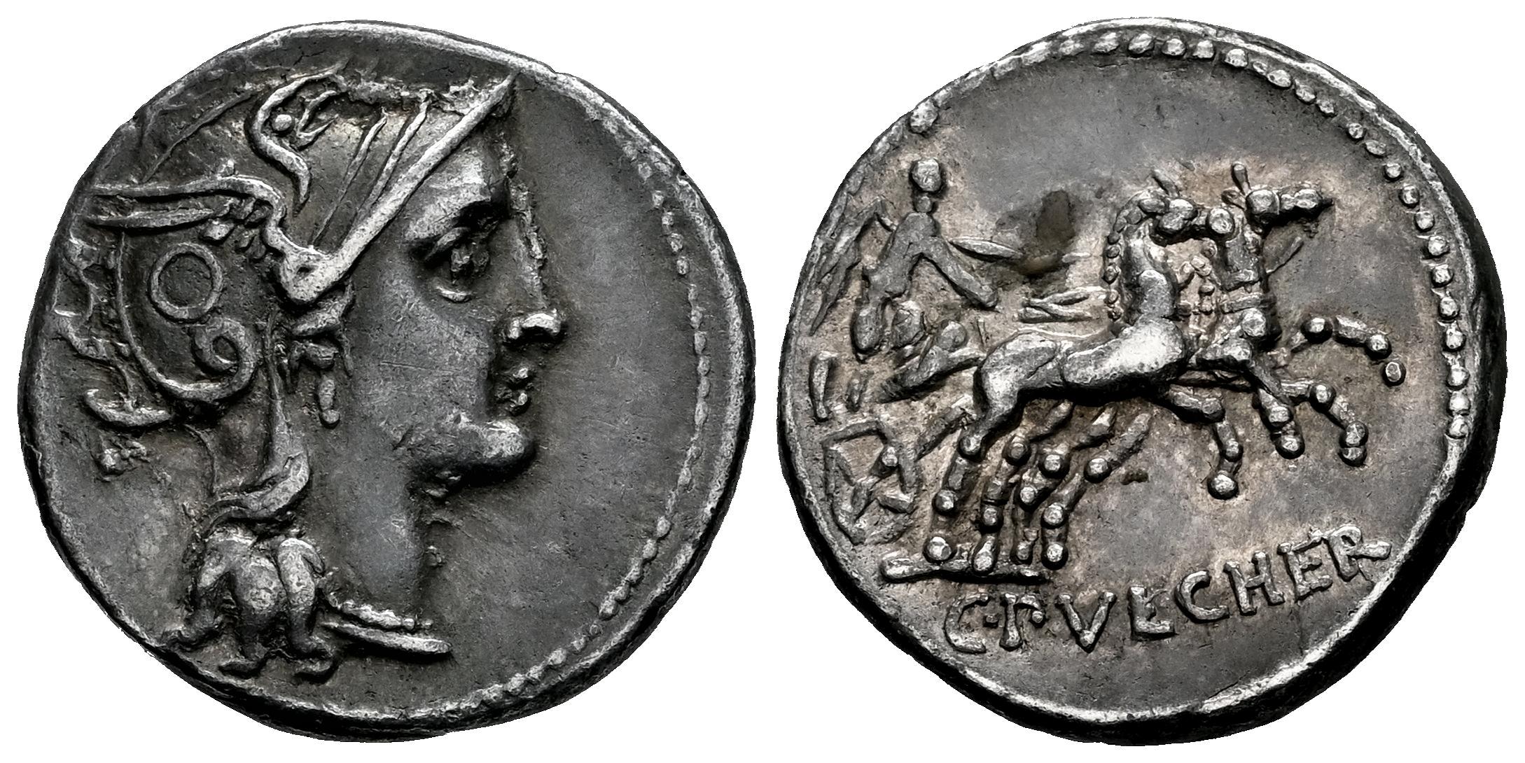 Claudia. C. Claudius Pulcher. Denario. 110-109 a.C. Roma. (Ffc-565). (Craw-300/1). (Cal-424). Anv.: Cabeza de Roma a derecha. Rev.: Victoria en biga a derecha, en el exergo: C. PVLCHER. Ag. 3,96 g. Suave pátina. Brillo original subyacente. Bella. EBC-. Est...200,00.