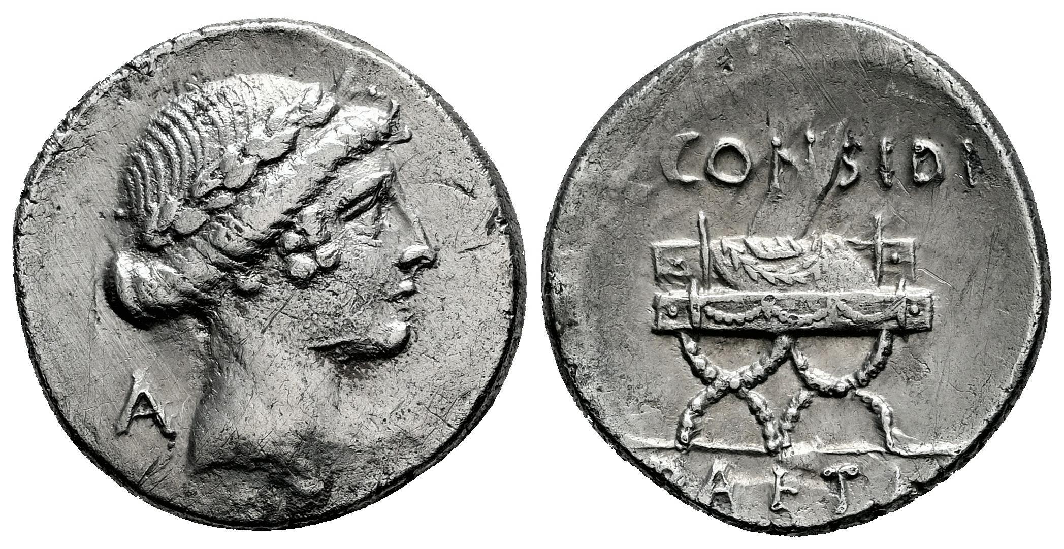 Considia. C. Considius Paetus. Denario. 46 a.C. Roma. (Ffc-596). (Craw-465/2b). (Cal-461). Anv.: Cabeza laureada de Apolo con una joya sobre la oreja a derecha, detrás: A., el borde del campo sin puntos. Rev.: Silla curul sobre la que se encuentra una corona, encima: C. CONSIDI., en el exergo: PAETI. Ag. 3,60 g. MBC/MBC+. Est...150,00.