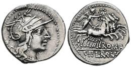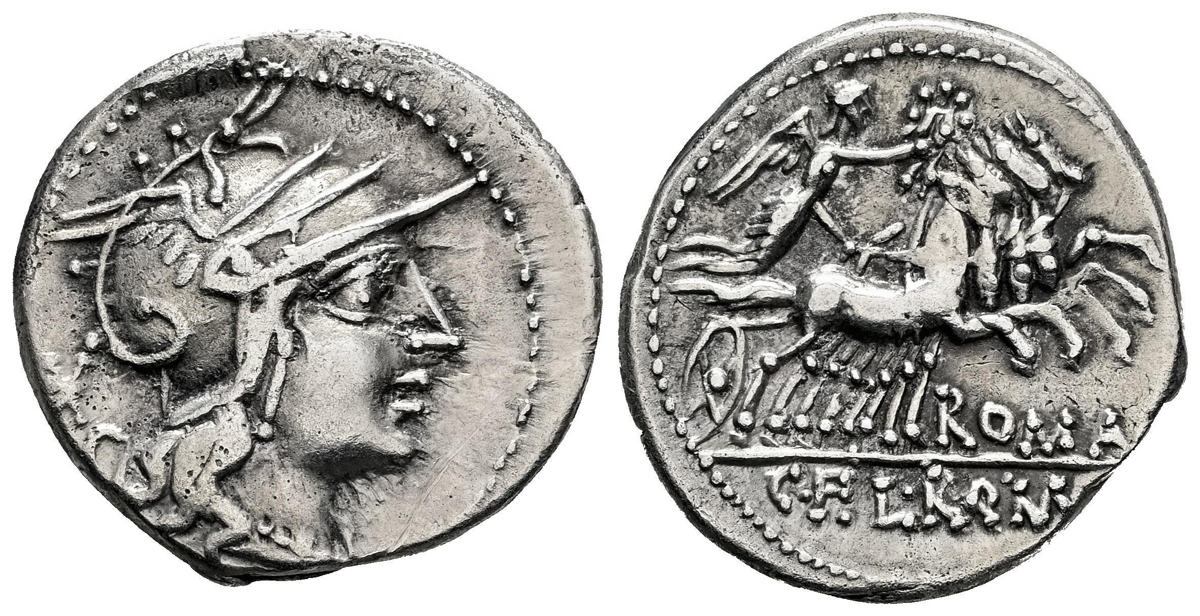 Fabia. C. Fabius L. Roscius y Q. Marcius. Denario. 127 a.C. Norte de Italia. (Ffc-701). (Craw-283/1b). (Cal-572). Anv.: Cabeza de Roma a derecha, detrás: X. Rev.: Victoria con corona en cuadriga a derecha,debajo: ROMA., en el exergo: C.F.L.R.Q.M. Ag. 3,86 g. Ex Tauler & Fau 61 (07/07/2020), lote 1127. MBC/MBC+. Est...90,00.