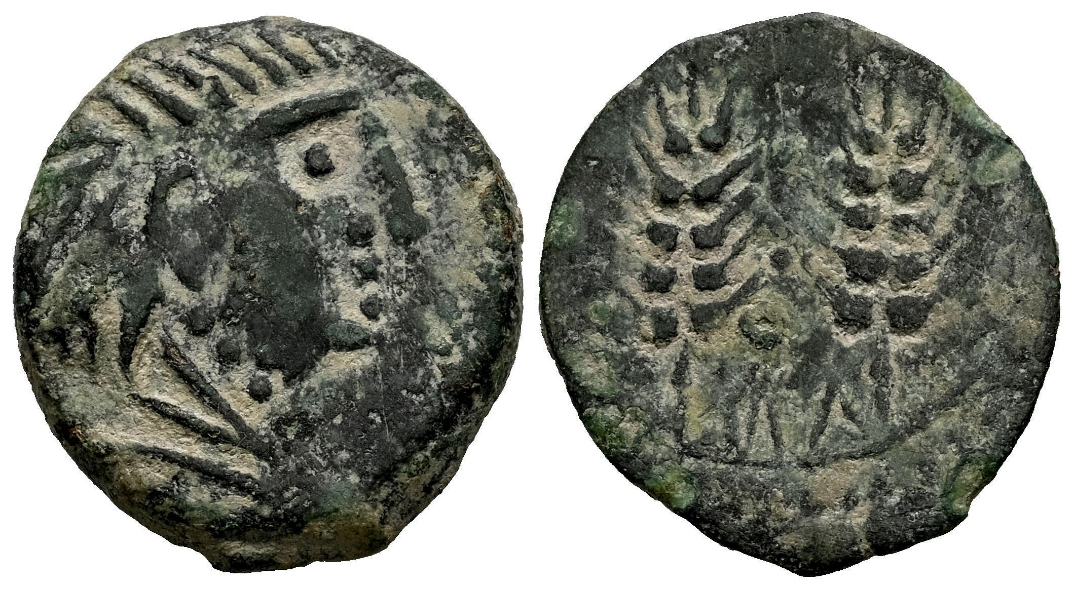 Norte de África. Tingis. AE 20. Siglo II-I a.C. Mauretania. (Mazard-606 var.). Anv.: Busto masculino con cabeza desnuda, drapeado y con collar a la derecha. Rev.: Dos espigas; punto arriba y TNGA (En neopúnico) abajo. Ae. 3,54 g. Arte tosco. MBC+. Est...120,00.