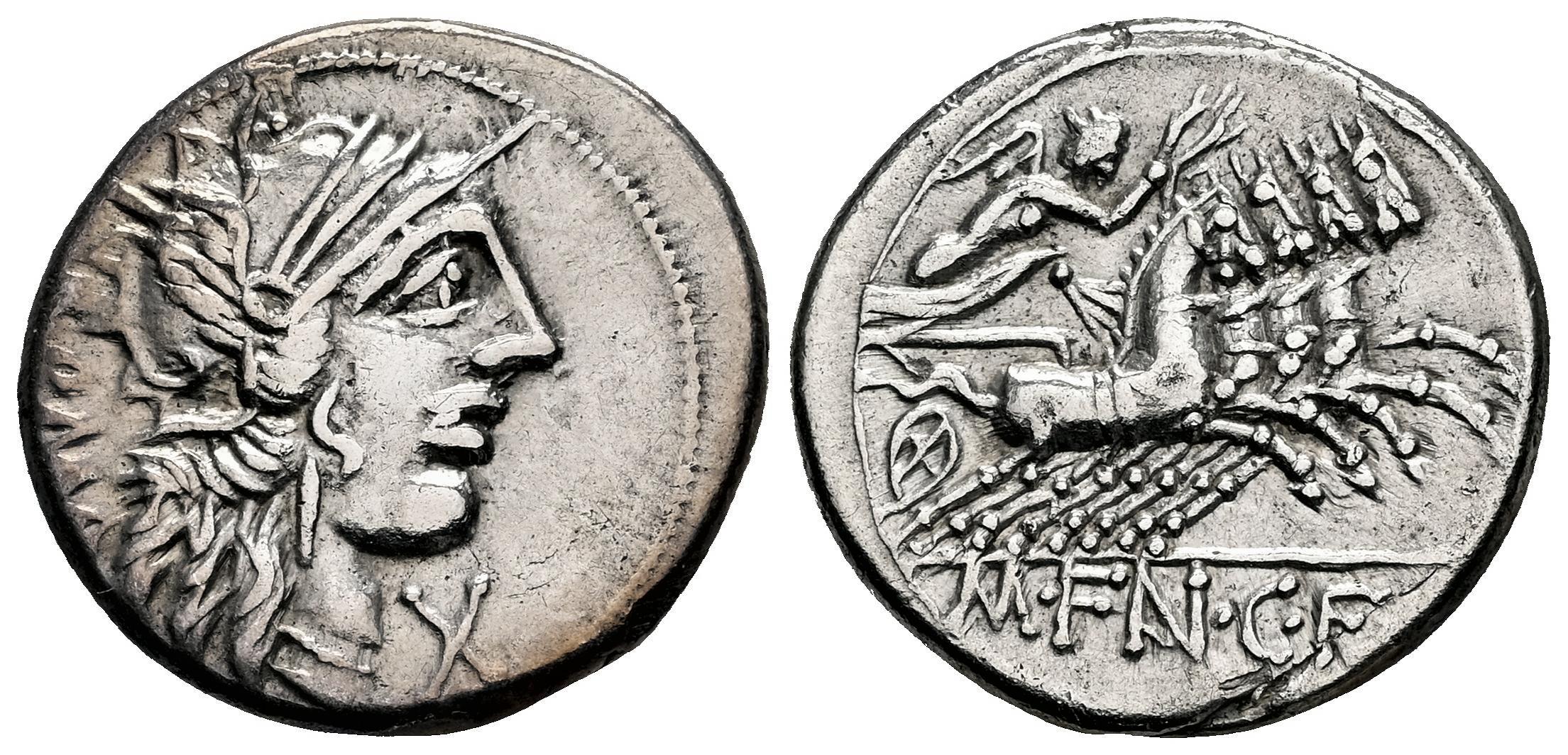 Fannia. Mareius Fannius C.f. Denario. 123 a.C. Taller Auxiliar de Roma. (Ffc-705). (Craw-275/1). (Cal-576). Anv.: Cabeza de Roma a derecha, delante: X, detrás: ROMA. Rev.: Victoria con corona en cuadriga a derecha, en el exergo: M. FAN. C.F., (AN entrelazadas). Ag. 3,74 g. Limpiada. Ex Tauler & Fau 113 (28/06/2022), lote 1103. MBC. Est...90,00.