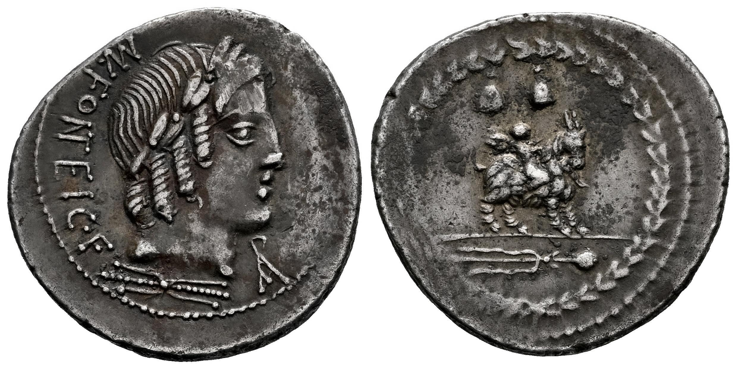 Fonteia. Mn. Fonteius C.F. Denario. 85 a.C. Taller Auxiliar de Roma. (Ffc-717). (Craw-353/1a). (Cal-589). Anv.: Cabeza laureada de Apolo Vejovis a derecha, debajo: haz de rayos, delante: ROMA en monograma, detrás: MN. FONTEI. C.F., (MN y NTE entrelazadas). Rev.: Genio sobre cabra a derecha, encima los dos gorros de los Dioscuros, debajo un tirso, todo ello dentro de una corona de laurel. Ag. 3,98 g. Suave pátina con ligero tono. MBC+. Est...160,00.