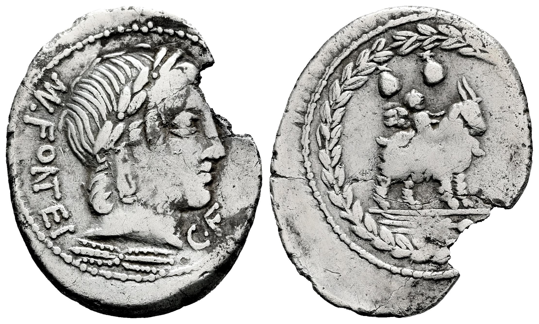 Fonteia. Mn. Fonteius C.F. Denario. 85 a.C. Taller Auxiliar de Roma. (Ffc-719). (Craw-353/1c). (Cal-590). Anv.: Cabeza laureada de Apolo Vejovis a derecha, debajo: haz de rayos, delante: C.F , detrás: MN. FONTEI, (MN y NT entrelazadas). Rev.: Genio sobre cabra a derecha, encima los dos gorros de los Dioscuros, debajo un tirso, todo ello dentro de una corona de laurel. Ag. 3,27 g. Cospel faltado. MBC-. Est...60,00.