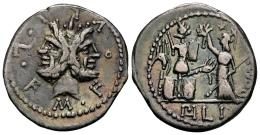 Furia. M. Furius L.f. Philus. Denario. 119 a.C. Italia Central. (Ffc-730). (Craw-281/1). (Cal-600). Anv.: Cabeza de Jano bifonte,M. FOVRI. L.F. Rev.: Roma de pie a izquierda, coronando un trofeo a cuyos lados hay dos escudos y dos carnyx, a derecha: ROMA., en el exergo: PHILI. Ag. 3,85 g. Bonita pátina de monetario con tonos iridiscentes. MBC+/MBC. Est...200,00.