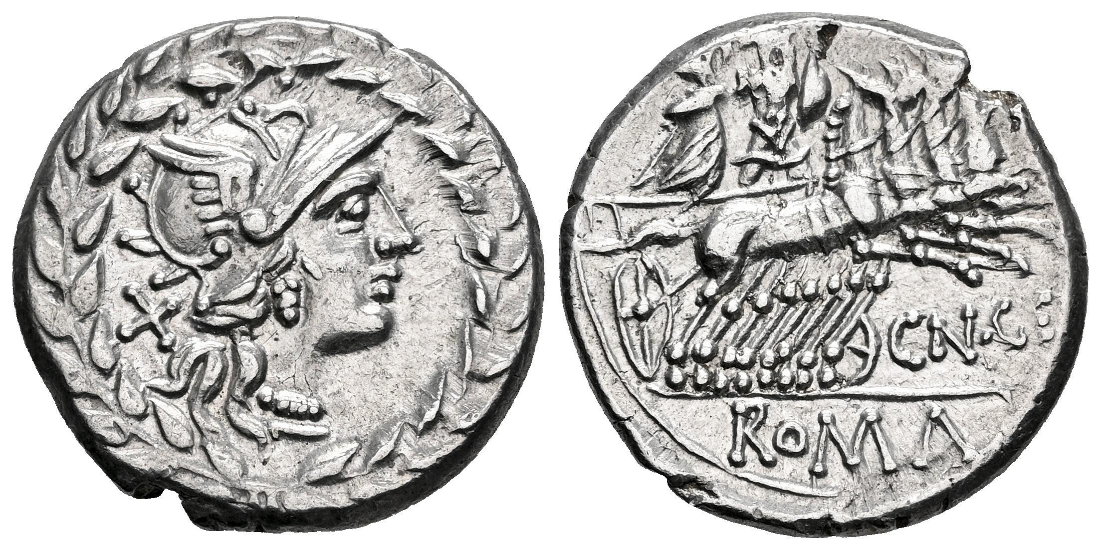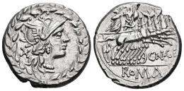 Gellia. Cnaeus Gellius. Denario. 138 a.C. Roma. (Ffc-742). (Craw-232/1). (Cal-612). Anv.: Cabeza de Roma a derecha, detrás: X., todo ello rodeado por corona de laurel. Rev.: Marte con escudo y Nerio Neriensis en cuadriga a derecha, debajo: CN. GE., en el exergo: ROMA. Ag. 3,67 g. Buen ejemplar. Ex Tauler & Fau 69 (10/11/2020), lote 2143. EBC-. Est...250,00.