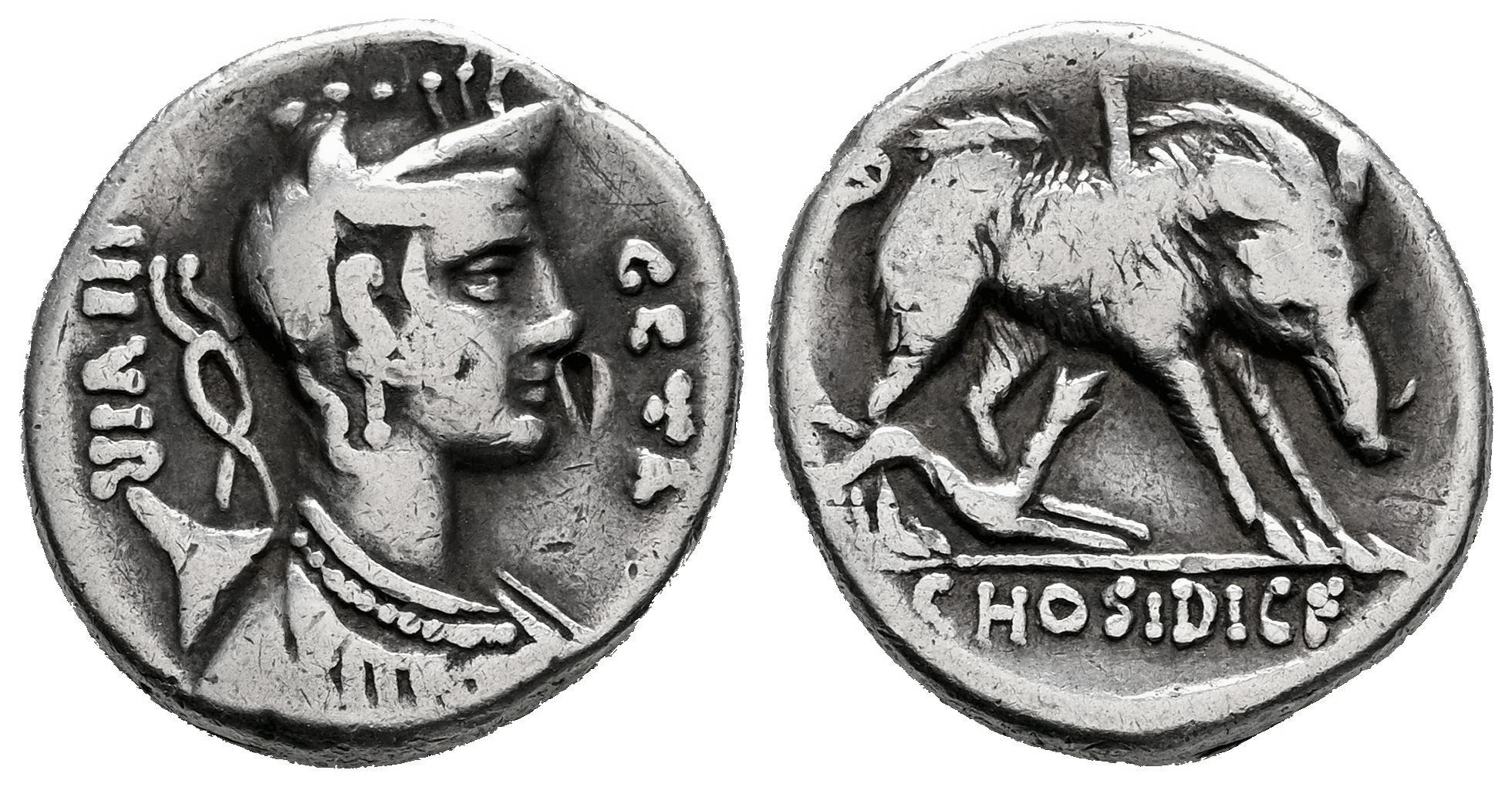 Hosidia. C. Hosidius C.f. Geta. Denario. 68 a.C. Sur de Italia. (Ffc-748). (Craw-407/2). (Cal-618). Anv.: Busto diademado de Diana a derecha, con arco y carcaj sobre las espaldas,GETA III. VIR. Rev.: Jabalí a derecha, atravesado por una flecha y atacado por un perro, en el exergo: C. HOSIDI. C.F. Ag. 3,85 g. MBC-. Est...70,00.