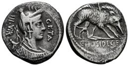 Hosidia. C. Hosidius C.f. Geta. Denario. 68 a.C. Sur de Italia. (Ffc-751). (Craw-407/2). Anv.: Busto diademado de Diana a derecha, con arco y carcaj sobre las espaldas, (busto más grande, con pelo y adorno en el cuello diferente), GETA III. VIR. Rev.: Jabalí a derecha, atravesado por una flecha y atacado por un perro, en el exergo: C. HOSIDI. C.F. Ag. 3,30 g. MBC-/MBC. Est...160,00.