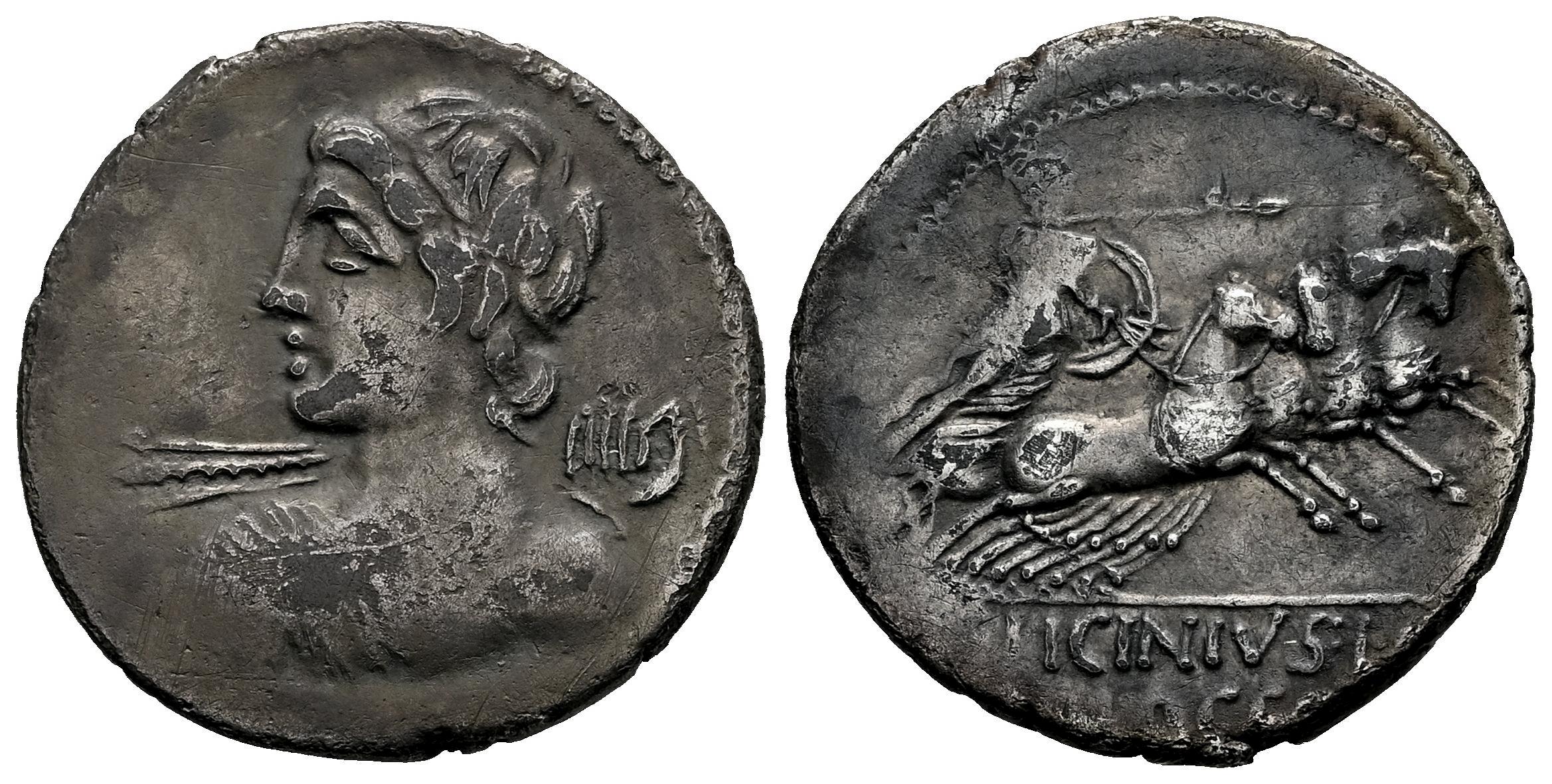 Licinia. C. Licinius L.f. Macer. Denario. 84 a.C. Taller Auxiliar de Roma. (Ffc-803). (Craw-354/1). (Cal-889). Anv.: Cabeza diademada de Apolo Vegovis a izquierda, visto desde atrás, con haz de rayos en la mano. Rev.: Minerva en cuadriga a derecha, con escudo, en el exergo. (C,) LICINIVS. L.(F. /M)ACE(R). Ag. 3,25 g. Suave pátina con ligero tono. MBC-. Est...100,00.