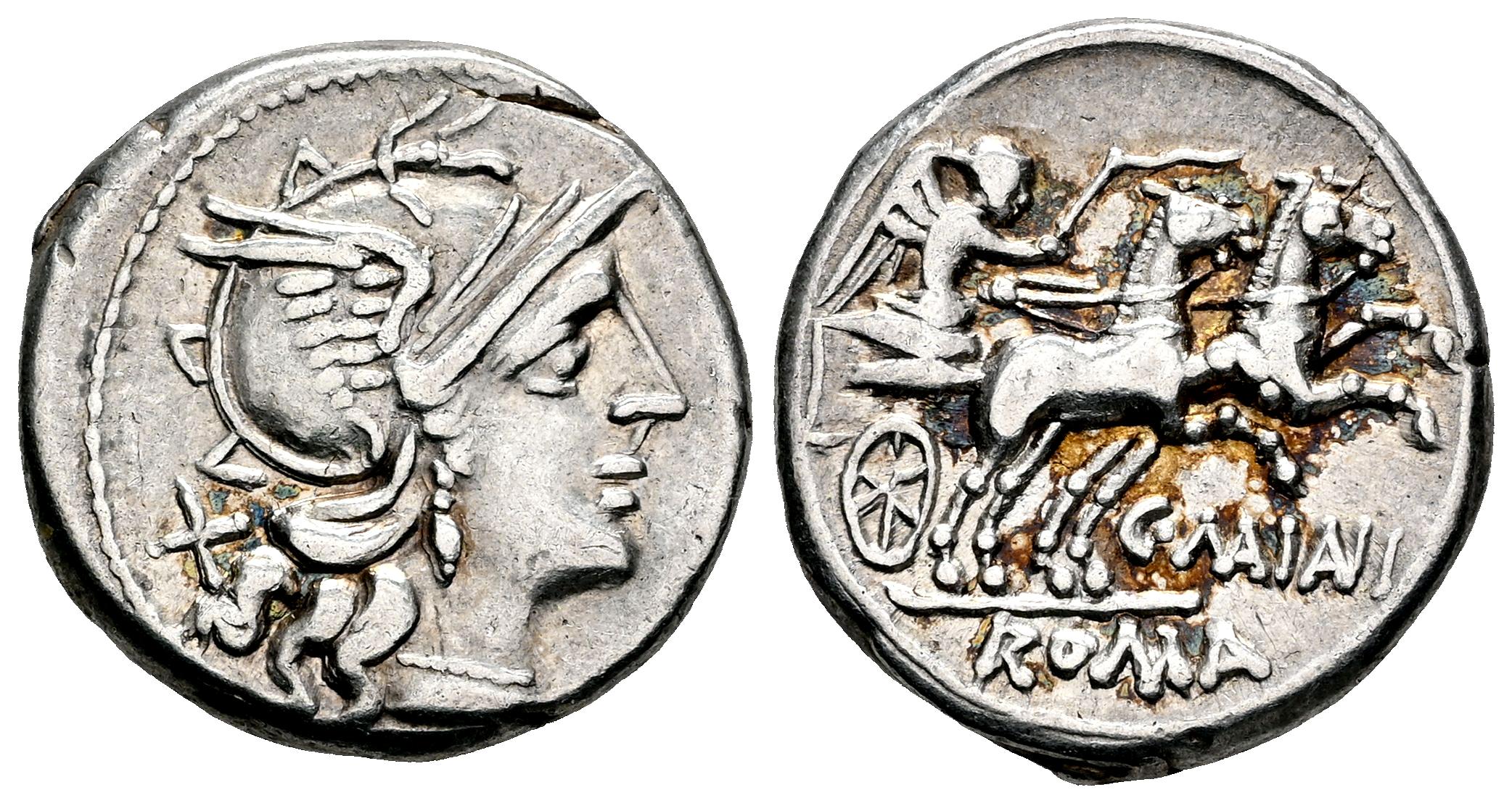 Maiania. C. Maianius. Denario. 153 a.C. Roma. (Ffc-832). (Craw-203/1a). (Tesorillo-Maiania 1, mismo ejemplar). Anv.: Cabeza de Roma a derecha, detrás: X. Rev.: Victoria con látigo en biga a derecha, debajo; C. MAIANI., (MA y AN entrelazadas), en el exergo: ROMA. Ag. 4,01 g. Bonito tono iridiscente. Bella. MBC+. Est...150,00.