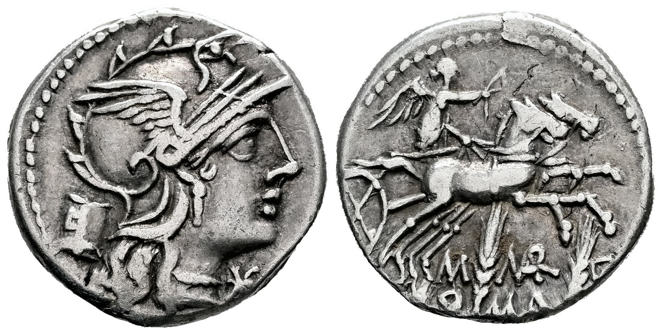 Marcia. M. Marcius Mn. f. Denario. 134 a.C. Roma. (Ffc-851). (Craw-245/1v). (Cal-934a). Anv.: Cabeza de Roma a derecha, detrás: "modius". Rev.: Victoria con látigo, en biga a derecha, debajo: dos espigas, entre ellas: M. MAR. C., (MAR entrelazadas), en el exergo: ROMA. Ag. 3,87 g. Escasa. MBC-. Est...110,00.