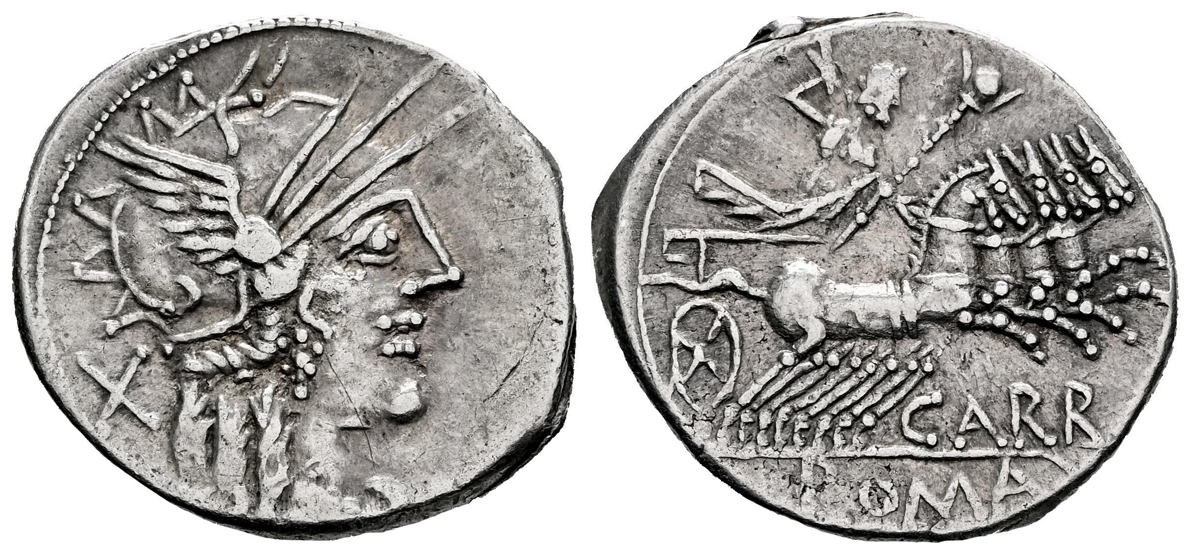 Papiria. Papirius Carbo. Denario. 122 a.C. Taller Auxiliar de Roma. (Ffc-958). (Craw-279/1). (Cal-1062). Anv.: Cabeza de Roma a derecha, detrás: X. Rev.: Júpiter con cetro y rayos en cuadriga a derecha, debajo: CARB., en el exergo: ROMA, en tablilla. Ag. 3,90 g. MBC. Est...100,00.