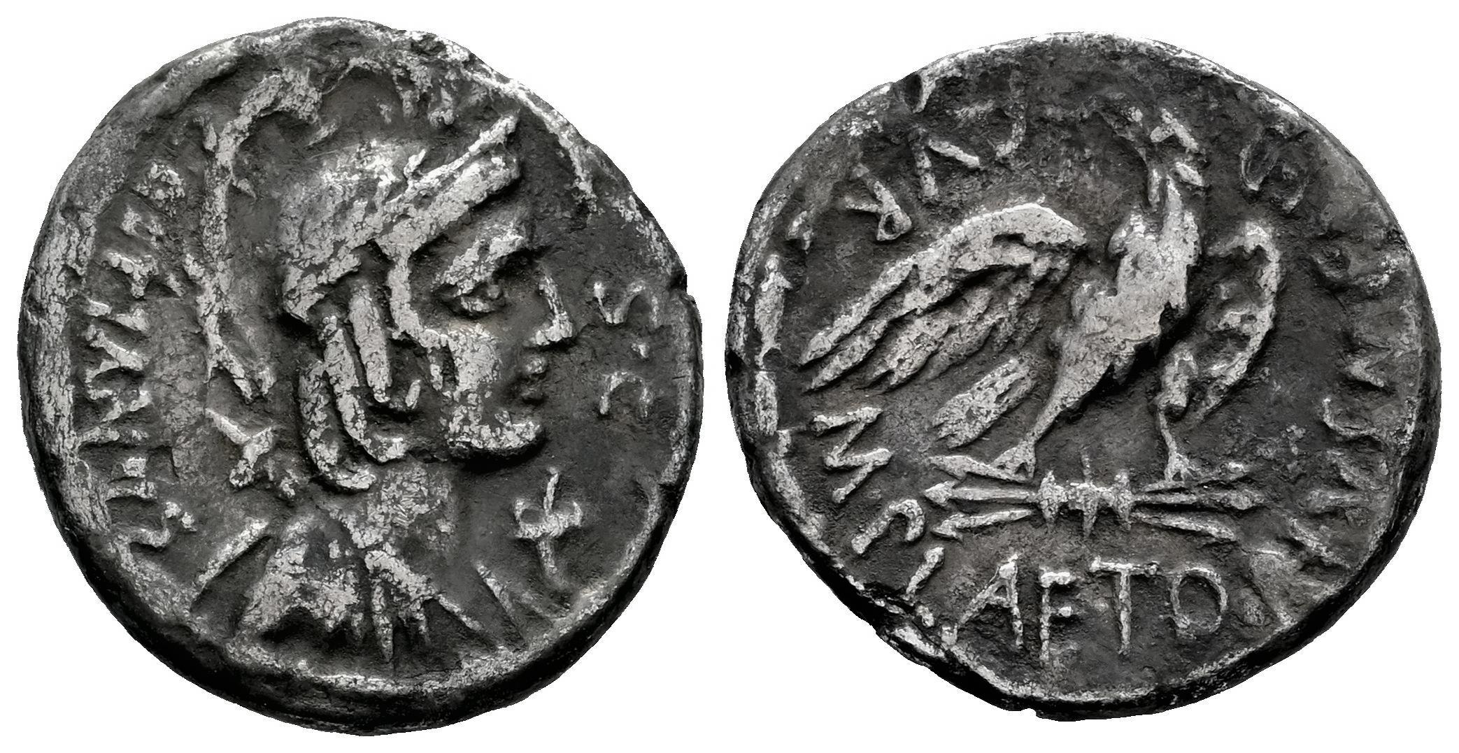 Plaetoria. M. Plaetorius M.f. Cestianus. Denario. 67 a.C. Roma. (Ffc-969). (Craw-409/1). (Cal-1106). Anv.: Cabeza con casco de la diosa Vacuna a derecha, delante: cuerno de la abundancia, detrás: arco y carcaj, CESTIANVS. S.C. Rev.: Águila a derecha mirando a izquierda, sobre haz de rayos, M. PLAETORIVS. M.F. AED. CVR. Ag. 3,69 g. MBC-. Est...100,00.