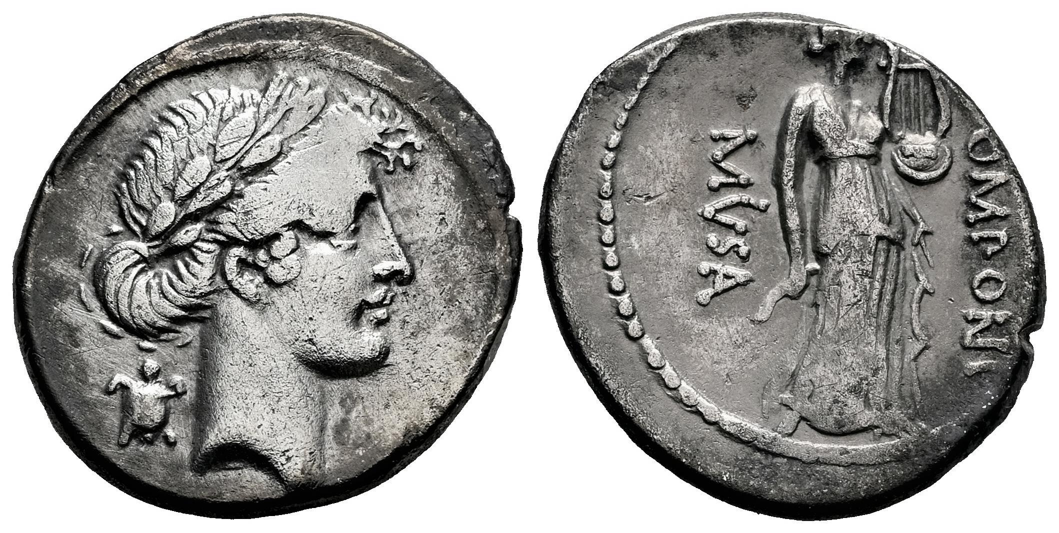 Pomponia. Q. Pomponius Rufus. Denario. 66 a.C. Roma. (Ffc-1044). (Craw-410/7a). (Cal-1190). Anv.: Cabeza laureada de Apolo a derecha, detrás: tortuga. Rev.: La musa Terpsicore de pie a derecha, con lira y "plectrum", a izquierda: MVSA., a derecha: (Q. P)OMPONI. Ag. 3,60 g. MBC-/MBC. Est...200,00.