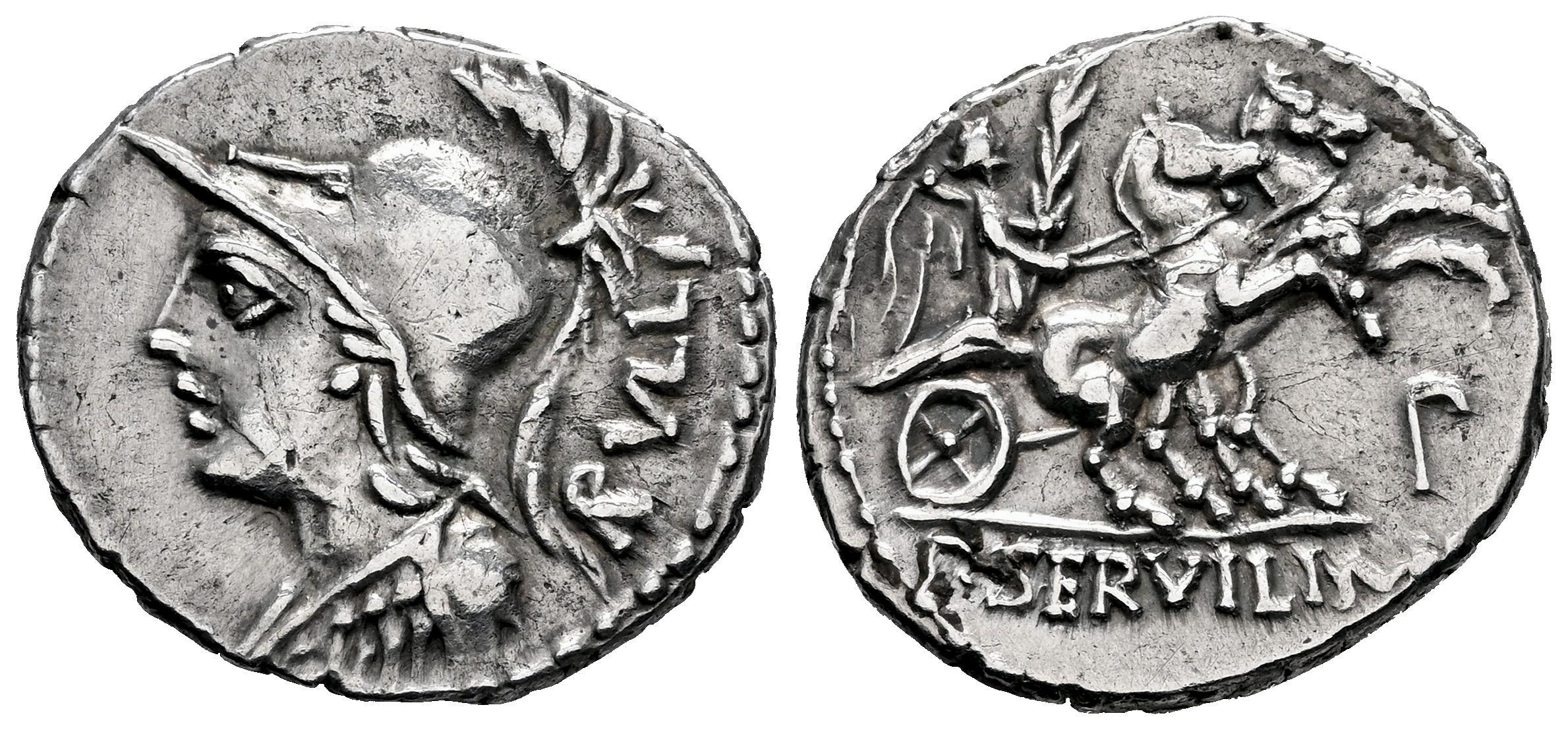 Servilia. P. Servilius M.f. Rullus. Denario. 100 a.C. Norte de Italia. (Ffc-1118). (Craw-328/1). (Cal-1277). Anv.: Cabeza de Minerva a izquierda,detrás: RVLLI. Rev.: Victoria con palma en biga a derecha, debajo: letra, en el exergo: P. SERVILI. M.F. Ag. 3,92 g. Ex Áureo & Calicó 250 (02/07/2020), lote 215. MBC+. Est...140,00.