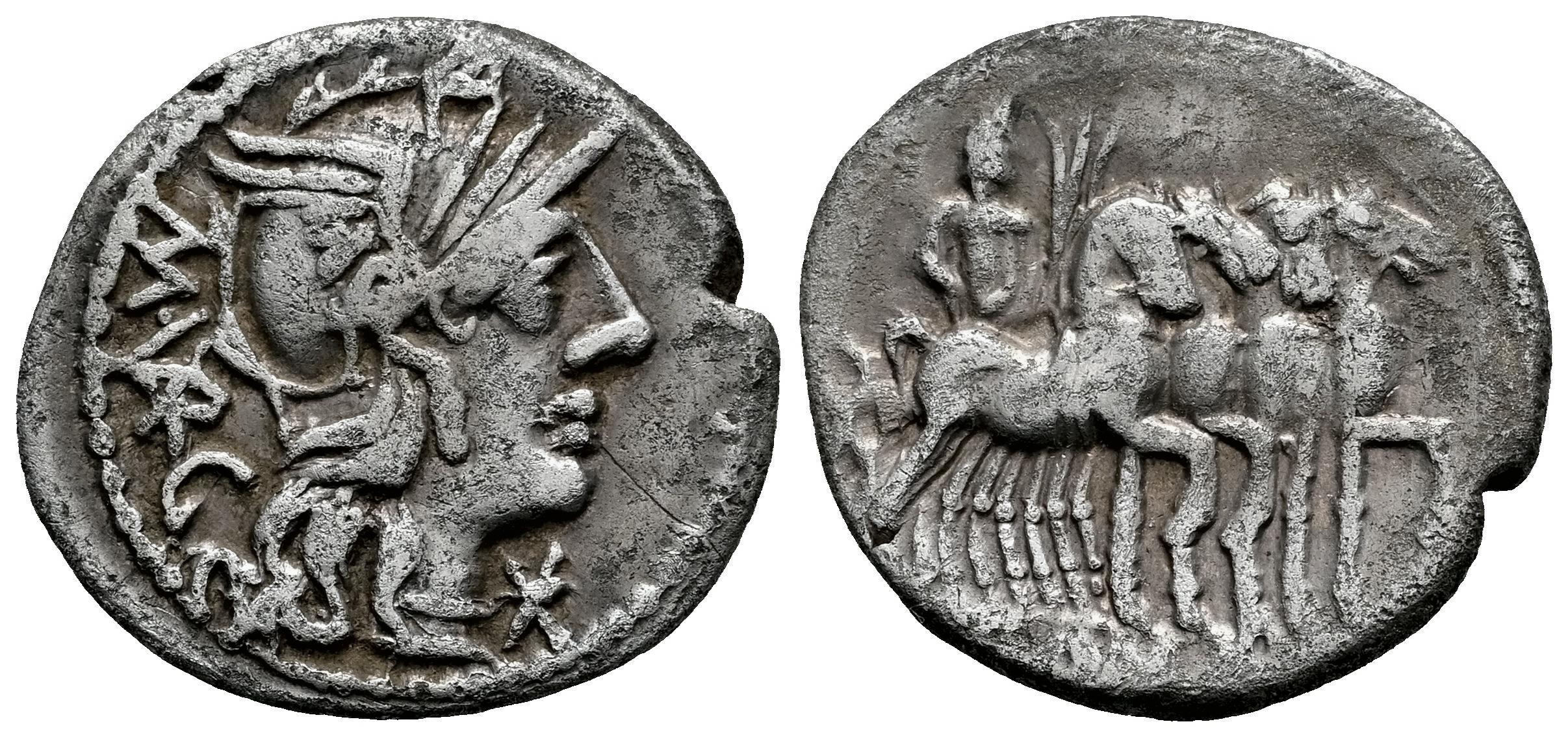 Vargunteia. Marcus Vargunteius. Denario. 130 a.C. Roma. (Ffc-1183). (Craw-257/1). (Cal-1339). Anv.: Cabeza de Roma a derecha, delante: X, detrás: M. VARG., (VAR entrelazadas). Rev.: Júpiter en cuadriga a derecha, con rama de palma y haz de rayos, en el exergo: (ROMA). Ag. 3,72 g. MBC-/BC+. Est...90,00.