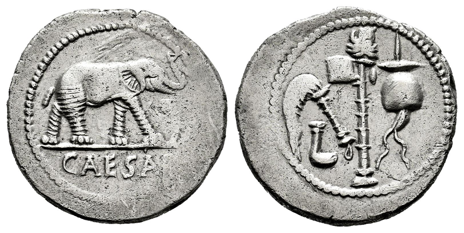Julio César. Denario. 54-51 a.C. Galia. (Ffc-50). (Craw-443/1). (Cal-640). Anv.: Elefante a derecha, delante una serpiente, en el exergo: CAESAR. Rev.: Símpulo, aspersorio, hacha y apex. Ag. 3,71 g. Acuñación muy bien centrada. Ligero vano. Leves rayas. MBC/MBC+. Est...1200,00.