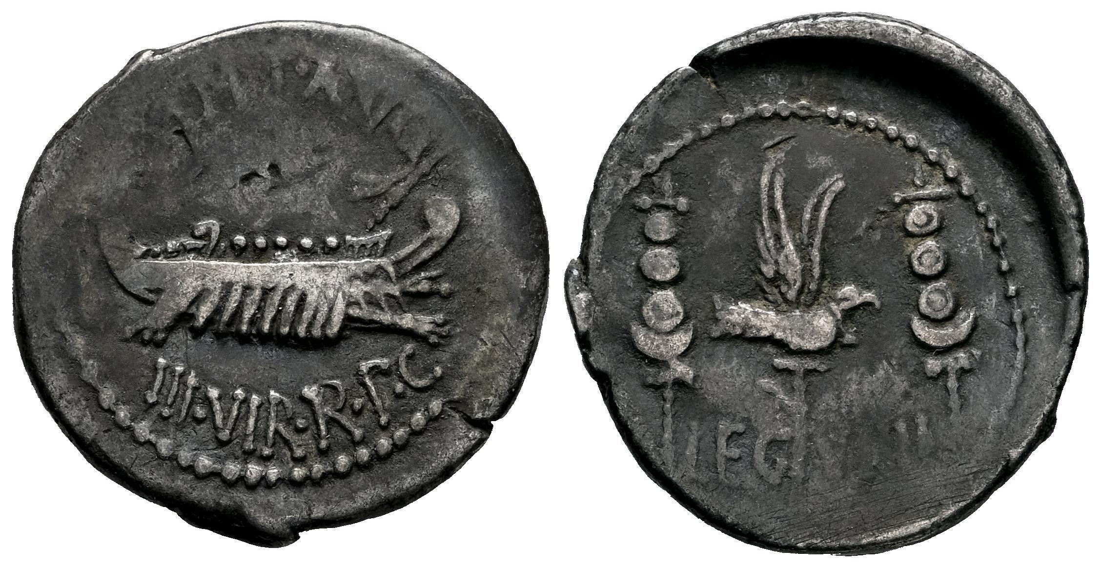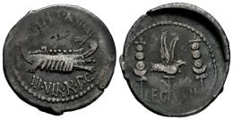 Marco Antonio. Denario. 32-31 a.C. Ceca volante. (Ffc-48). (Craw-544/28). (Cal-195). Anv.: Galera pretoriana a derecha, ANT. AVG. III. VIR. R.P.C. Rev.: Águila legionaria entre dos insignias militares, LEG. XIIII. Ag. 3,57 g. Pátina. MBC-. Est...220,00.
