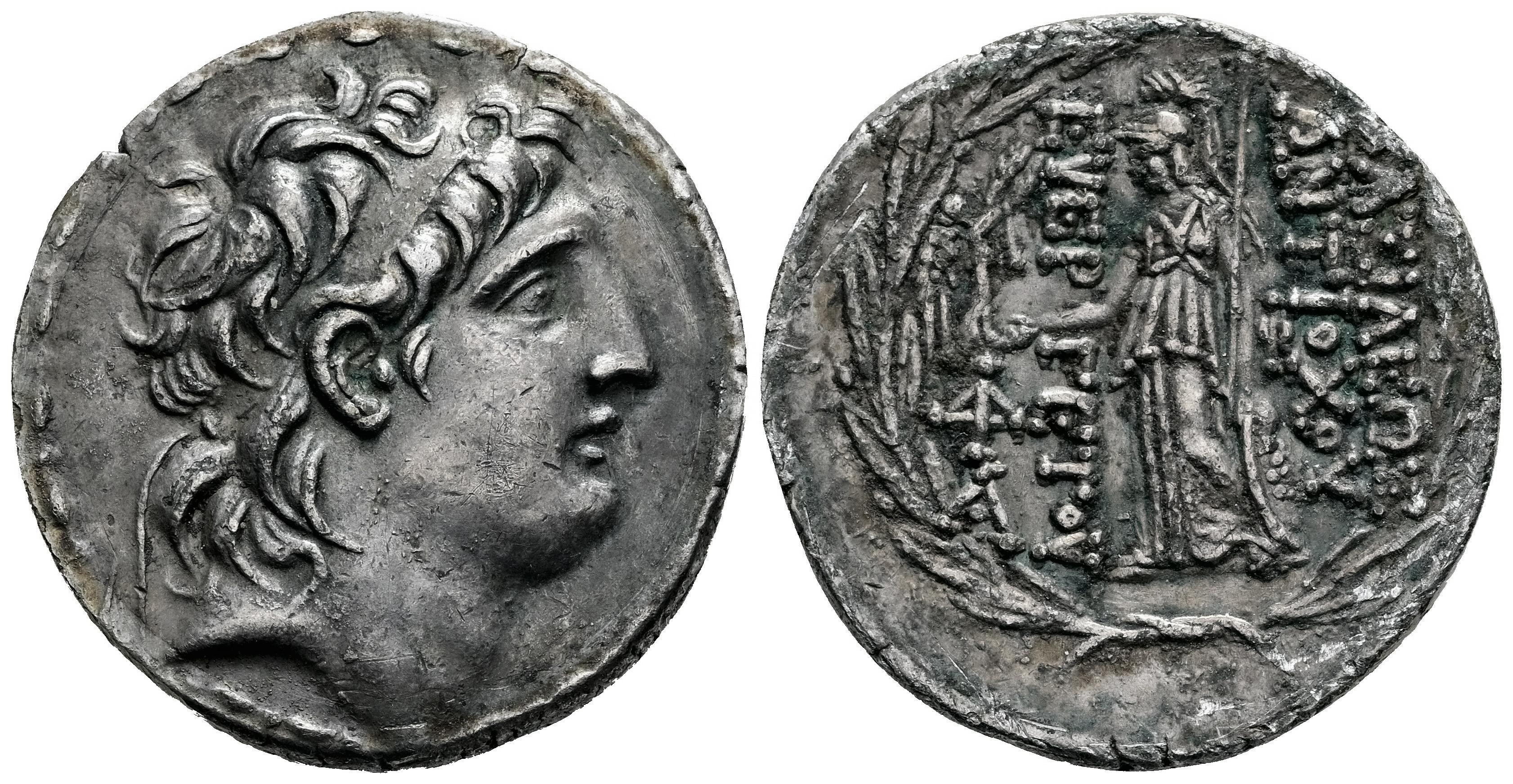 Imperio Seléucida. Antiochos VII Euergetes. Tetradracma. 138-129 a.C. Antioquía del Orontes. (Hgc-9, 1067d). Anv.: Cabeza diademada a derecha. Rev.: Atenea estante a izquierda, sosteniendo Niké en la mano derecha y lanza y escudo con la izquierda; leyenda ΒΑΣΙΛΕΩΣ ΑΝΤΙΟΧΟY a la derecha y EYEPΓETOY a la izquierda; monograma sobre A en el campo externo izquierdo. Φ en el campo interno izquierdo. Ag. 15,95 g. Restos de verdín. MBC+. Est...250,00.