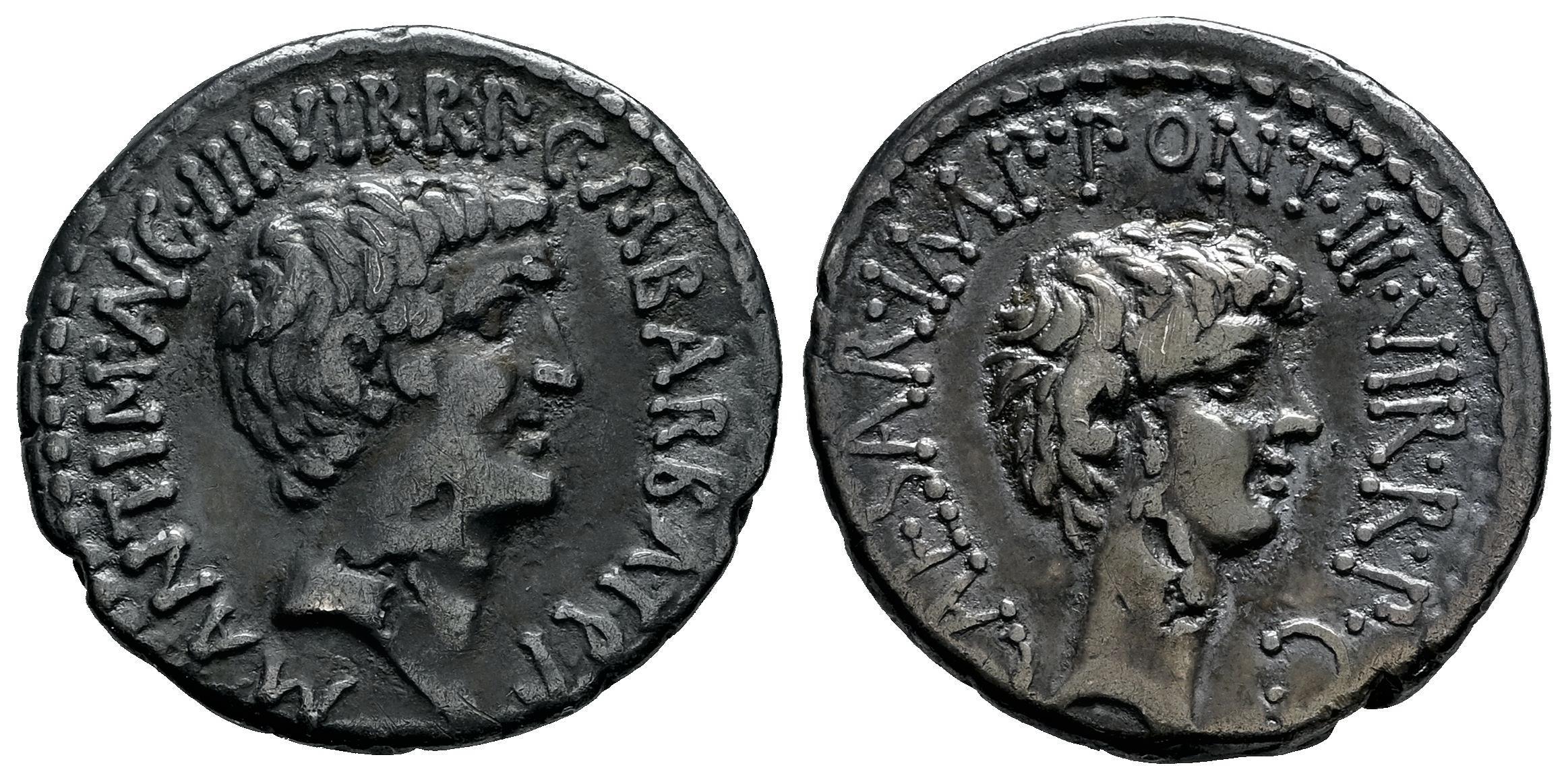 Marco Antonio y Augusto. M. Barbatius Pollio, Quaestor Pro Praetore. Denario. 41 a.C. Ceca militar móvil junto a Marco Antonio. (Ffc-8). (Craw-517/2). (Rsc-8a). Anv.: Cabeza descubierta de Marco Antonio a derecha, M•ANT•IMP•AVG•III•VIR•R•P•C•M•BARBAT•Q•P, (MP y AV entrelazadas). Rev.: Cabeza descubierta de Octavio a derecha, CAESAR•IMP•PONT•III•VIR•R•P•C•. Ag. 3,87 g. Marcas de banquero. Pátina original. MBC/MBC+. Est...700,00.