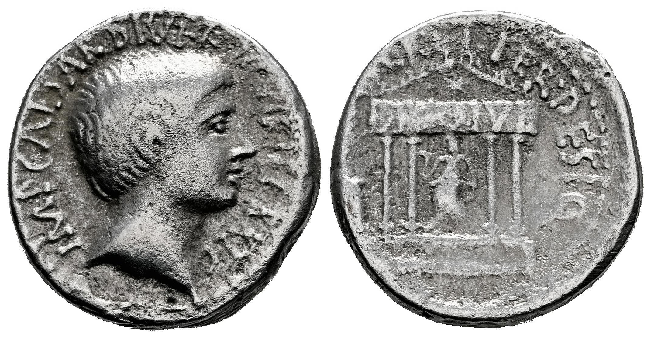 Augusto. Denario. 36 a.C. Ceca volante. (Ffc-71). (Ric-no cita). (Cal-669). Anv.: Cabeza descubierta y barbada de Octavio a derecha Ley./ IMP. CAESAR DIVI. (F. III. VIR. ITER. R.P.C). Rev.: Templo tetrástilo, en el frontón, una estrella, en el pórtico la estatua de Julio Cesar con lituo y al lado un altar, en el friso: DIVO. IVL., en circulo: (COS. ITER ET) TER. DESIG. Ag. 3,86 g. BC+/BC. Est...300,00.