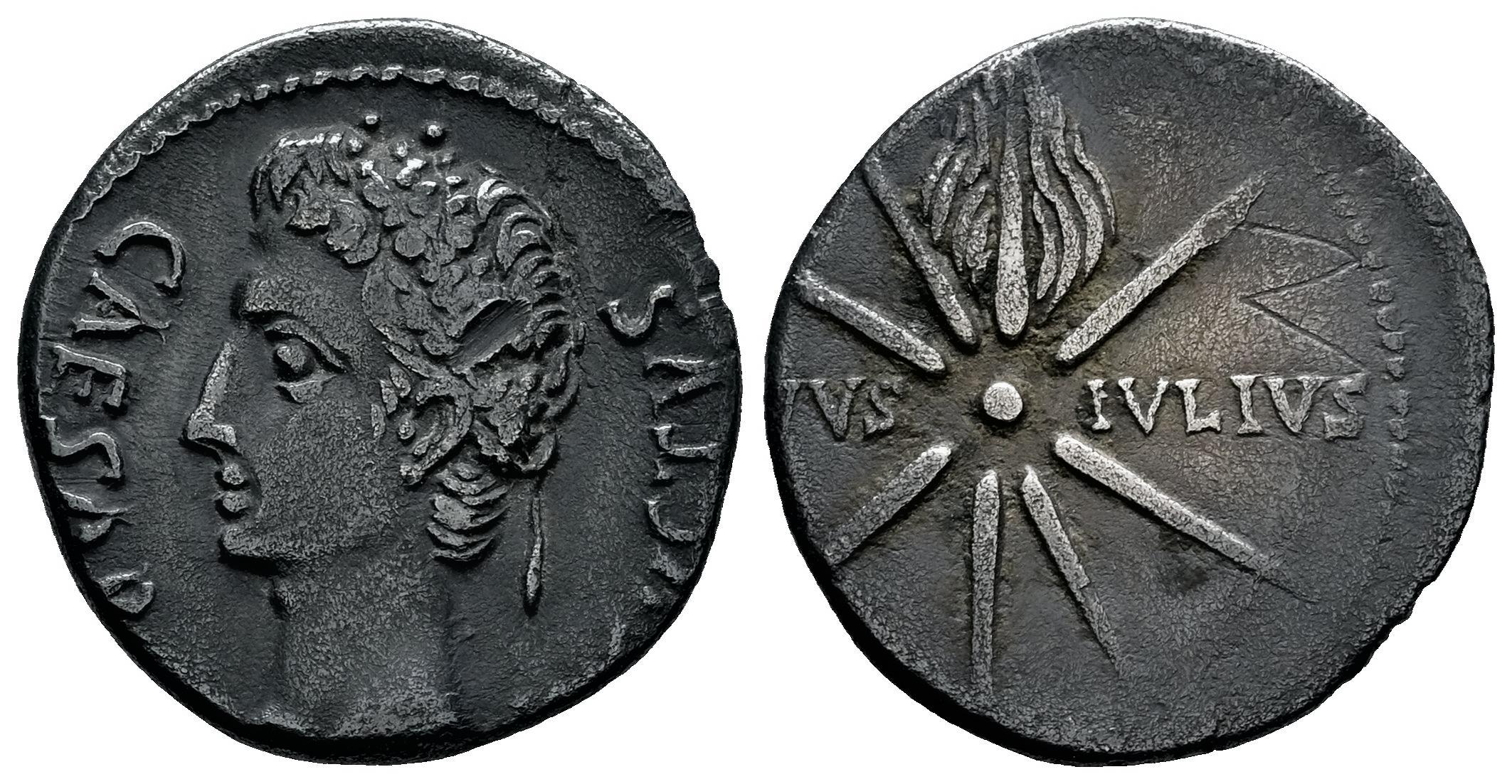 Augusto. Denario. 19-18 a.C. César Augusta (Zaragoza). (Ffc-75). (Ric-37b). (Cal-703). Anv.: Cabeza laureada de Augusto a izquierda, CAESAR (AVG)VSTVS. Rev.: Cometa de ocho rayos, en el campo: (DIV)VS - IVLIVS. Ag. 2,85 g. Pátina. Golpecito en anverso y graffiti en reverso. MBC+. Est...500,00.