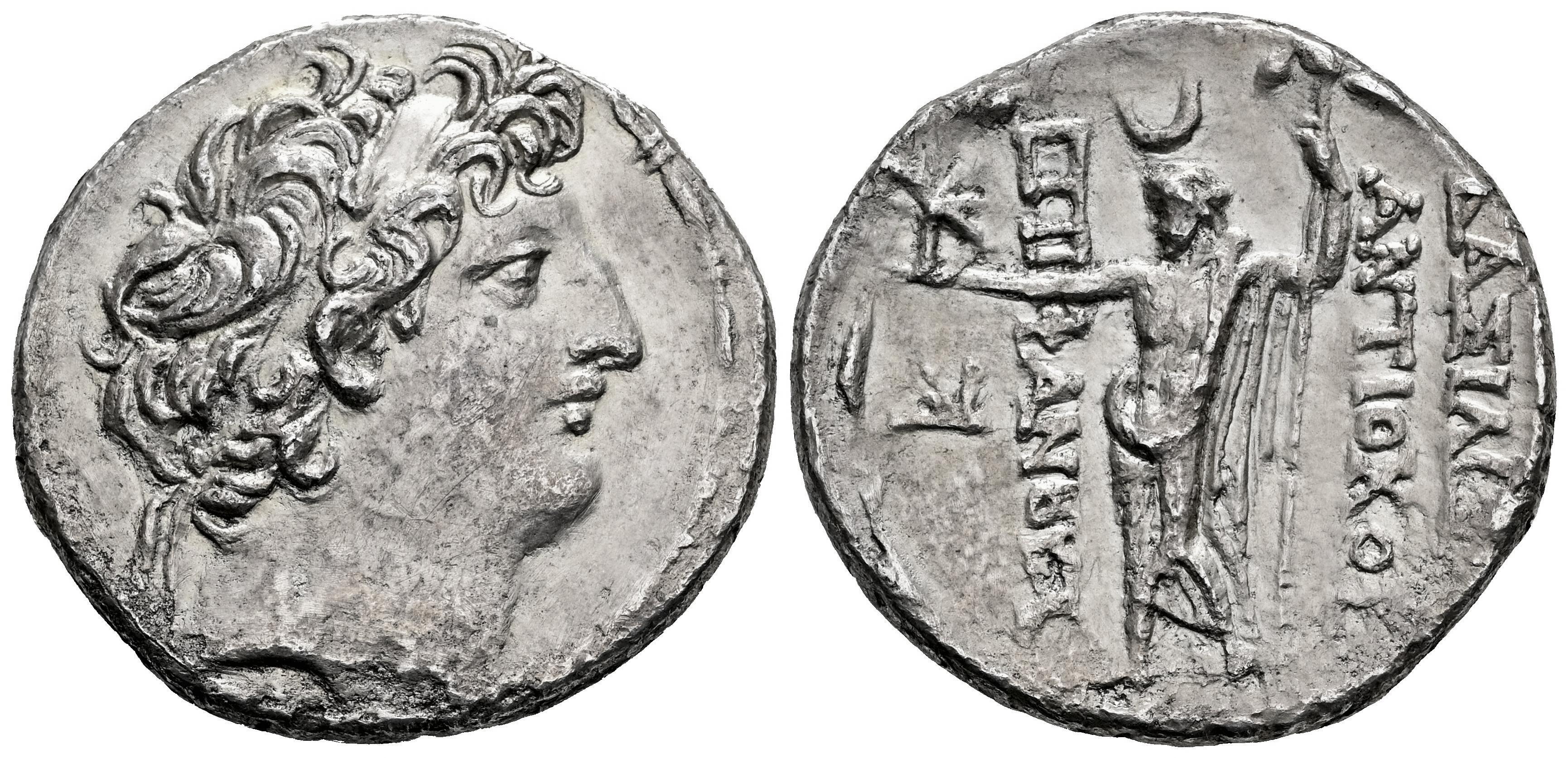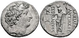 Imperio Seléucida. Antiochos VIII Epiphanes. Tetradracma. 121-113 a.C. Ptolemais-Ake. (SC-2336.2). (Hgc-9, 1196g). Anv.: Cabeza diademada de Antioco a derecha. Rev.: ΒAΣΙΛEΩΣ ΑNTIOXOY EΠIΦANOYΣ. Zeus Ouranios, con manto, de pie de frente, con la cabeza girada hacia la izquierda, sosteniendo una estrella en la mano extendida y un largo cetro, con una media luna en la parte superior y un monograma en el campo. Ag. 14,97 g. Leves oxidaciones limpiadas. EBC. Est...400,00.