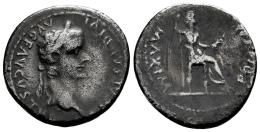 Tiberio. Denario. 36-37 d.C. Lugdunum. (Ric-I 30). (Bmc-48). (Rsc-16a). Anv.: TI CAESAR DIVI AVG F AVGVSTVS. Cabeza laureada a la derecha. Rev.: PONTIF MAXIM. Livia como Pax sedente a la derecha en una silla con patas ornamentadas, sus piernas drapeadas descansando sobre un escabel, sosteniendo cetro y rama; en una línea exergual simple. Ag. 3,47 g. BC+/BC. Est...75,00.
