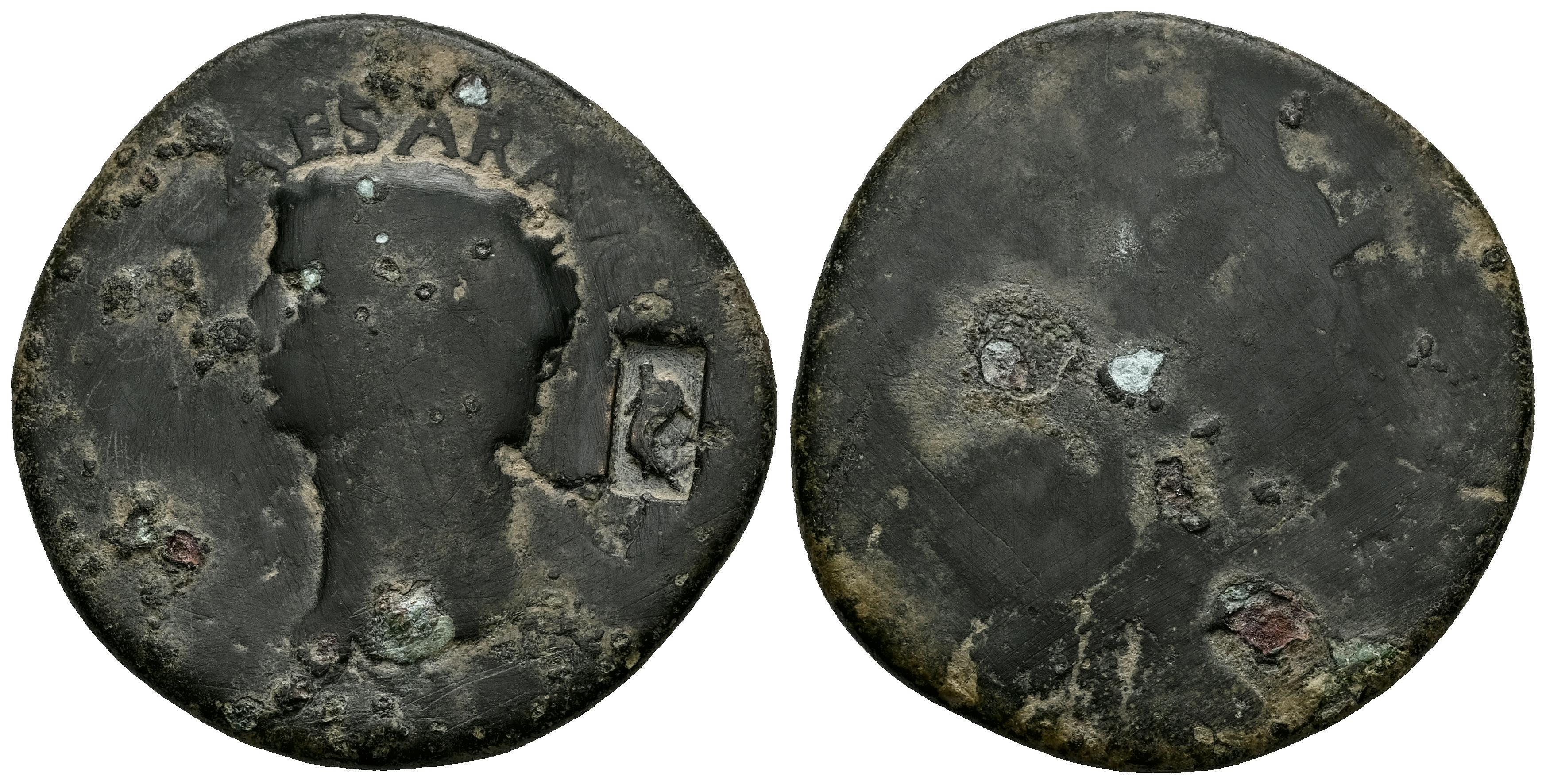 Claudio I. Dupondio. 41-50 d.C. Roma. (Ric-I 110). (Tesorillo-Tipo 1/05). Anv.: TI CLAVDIVS CAESAR AVG P M TR P IMP P P. Cabeza desnuda a la izquierda. Rev.: CERES AVGVSTA. Ceres, velada y drapeada, sedente a la izquierda, sosteniendo espigas y una antorcha larga; SC en exergo. Ae. 12,93 g. Contramarca de "delfín o marsopa" dentro de cartela rectangular hacia la izquierda sobre el anverso. Muy bien definido. Rara. BC/BC-. Est...80,00.