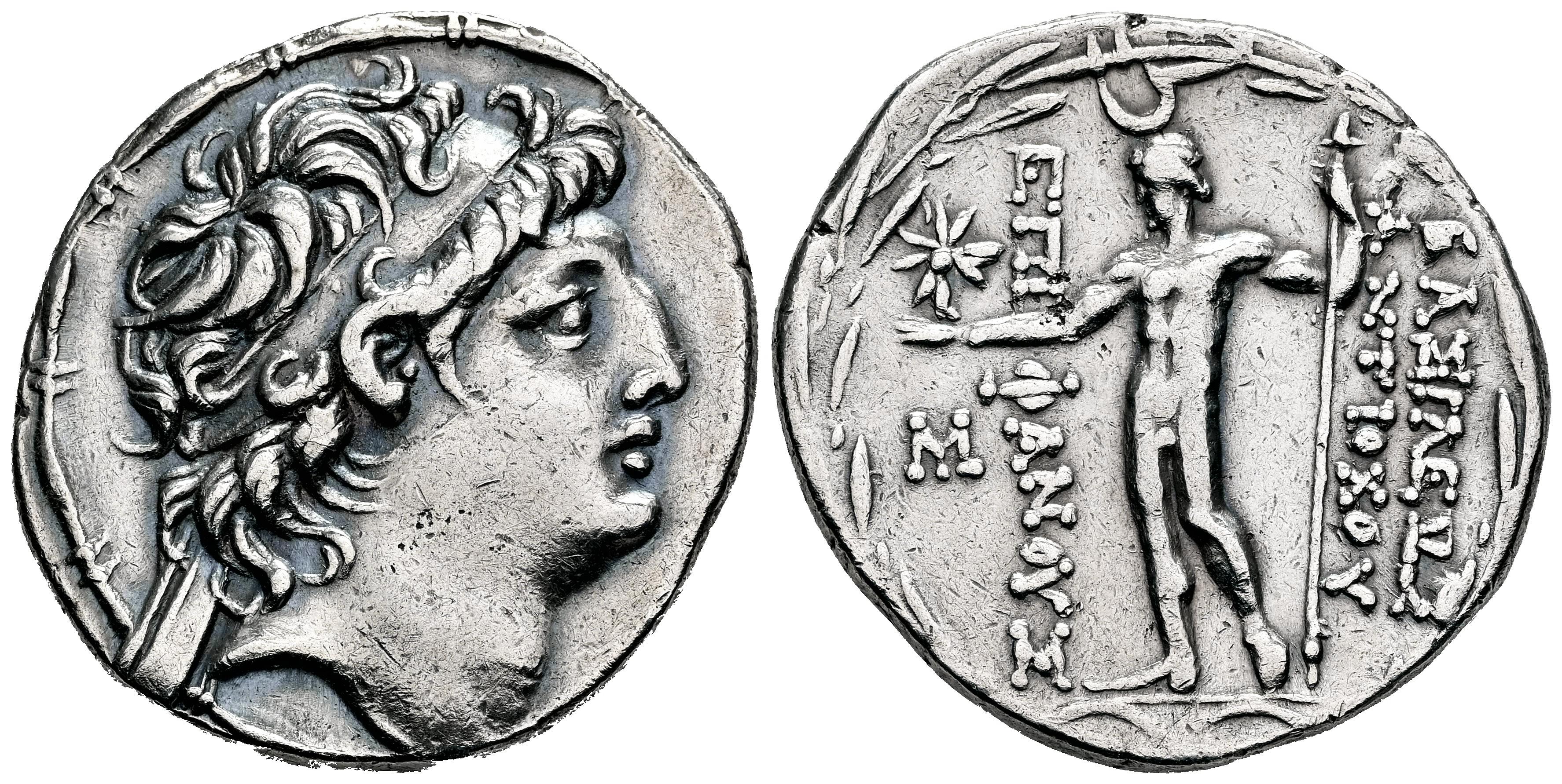Imperio Seléucida. Antiochos VIII Epiphanes. Tetradracma. 121-113 a.C. Ptolemais-Ake. (Hgc-9, 1196g). Anv.: Cabeza diademada de Antioco a derecha. Rev.: BAΣIΛEΩΣ ANTIOXOY EΠIΦANOYΣ. Zeus, en pie, desnudo de frente, cabeza a la izquierda, sosteniendo la estrella con la mano extendida y el cetro largo, media luna arriba; a la izquierda, M. Ag. 16,44 g. Limpiada. Ex Tauler & Fau 70 (24/11/2020), lote 25. EBC-/MBC+. Est...200,00.
