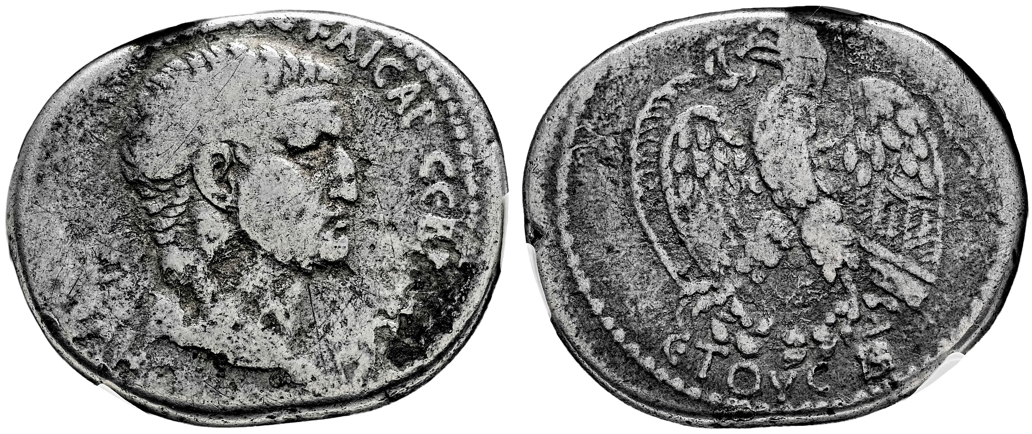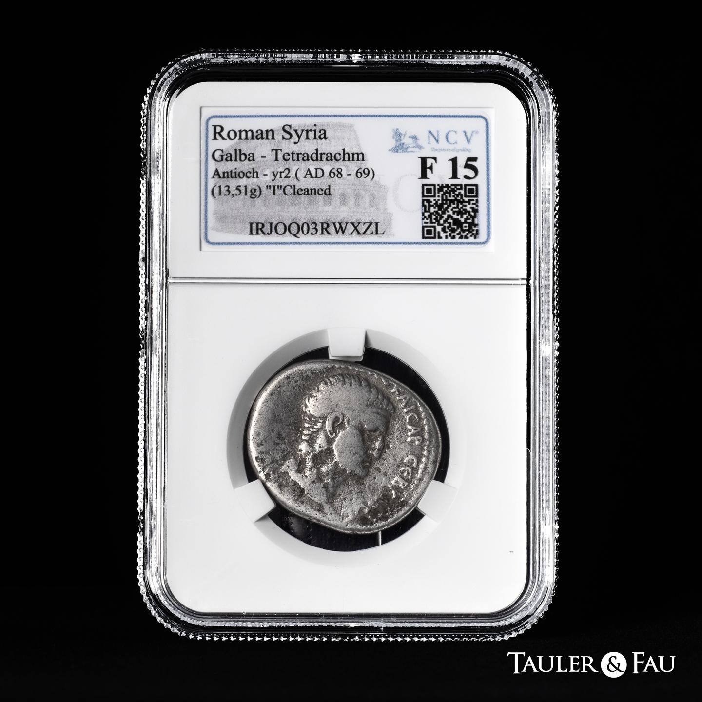 Galba. Seleucis y Pieria. Tetradracma. RY 2 = 68/9 d.C. Antioquía. (RPC-I 4198). (Prieur-100). (McAlee-308). Anv.: AY(TOKPATѠP ΓAΛBAC) KAICAP CEBACTOC. Cabeza desnuda a la derecha. Rev.: Águila en pie a la izquierda con las alas extendidas sobre una corona abierta, sosteniendo la corona en el pico; ЄTOVC B (fecha) en el exergo. Ag. 13,51 g. Rara. Ex Cgb.fr E-Shop 625929. Encapsulada por NCV como F 15. Cleaned. NCV-F. Est...250,00.