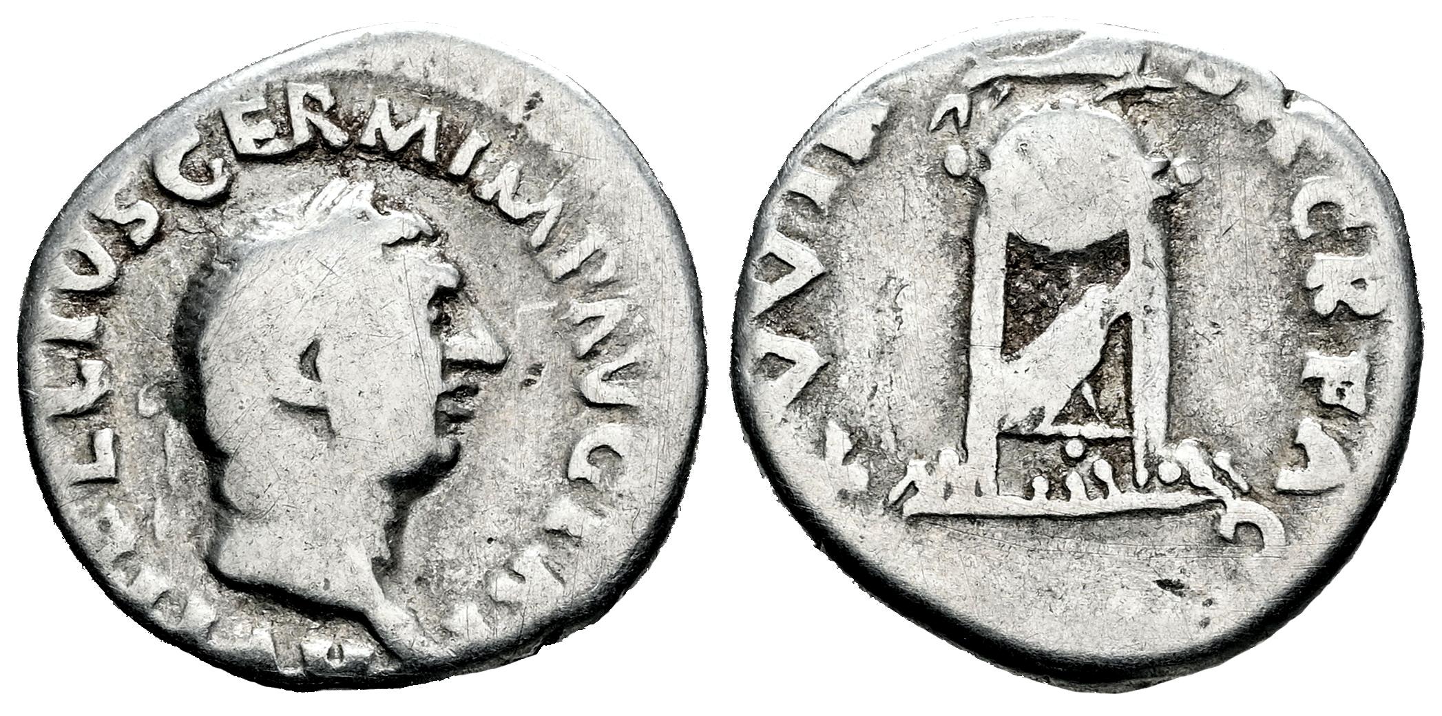Vitelio. Denario. 69 d.C. Roma. (Ric-I 86). (Bmcre-17). (Rsc-114). Anv.: A VITELLIVS GERMAN IMP TR P. Cabeza laureada a la derecha. Rev.: SACR FAC XV VIR. Trípode rematado con delfín a la derecha; cuervo en pie a la derecha debajo. Ag. 2,97 g. BC. Est...50,00.