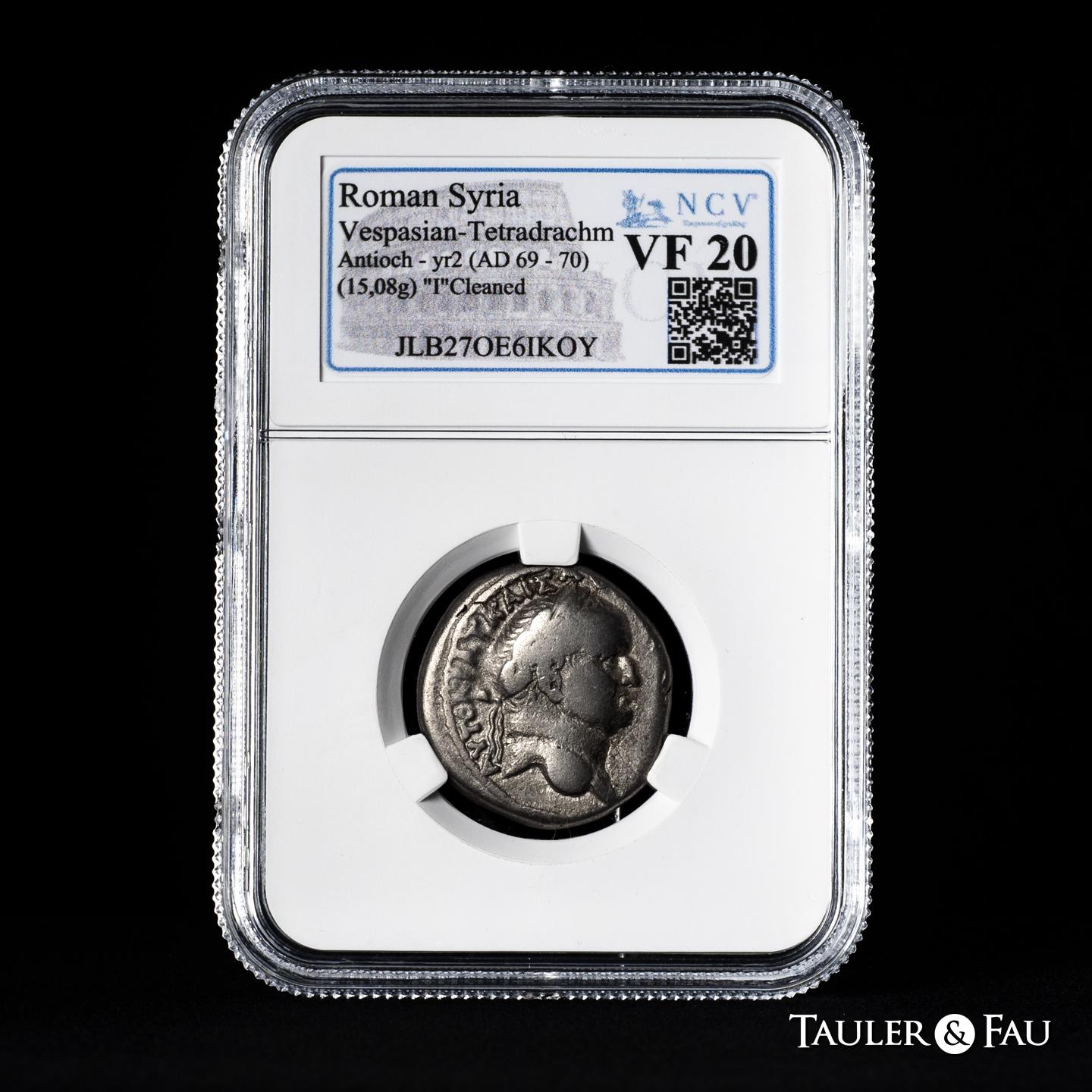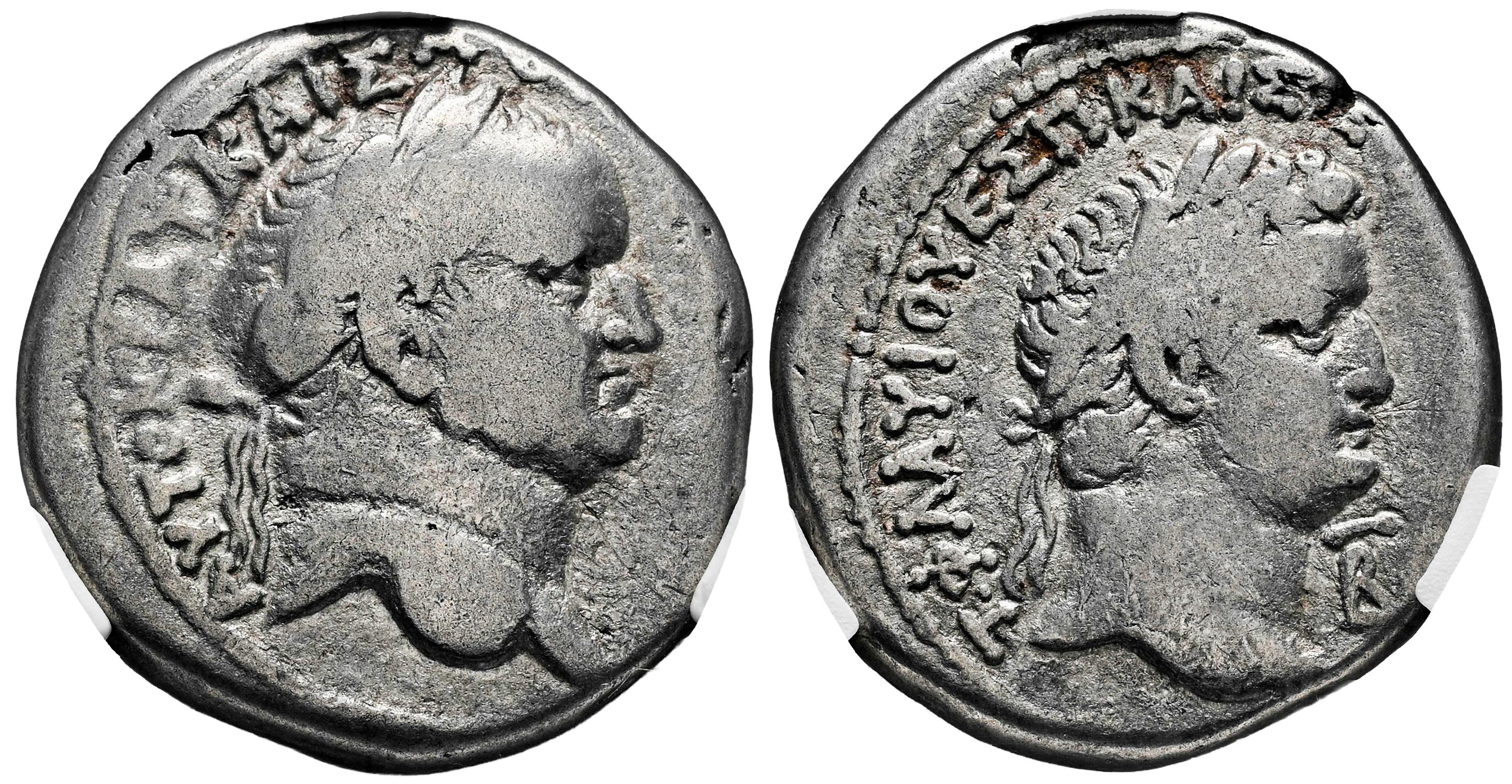Vespasiano, con Tito como Caesar. Seleucis y Pieria. Tetradracma. HY 2 = 69/70 d.C. Antioquía. (RPC-II 1940). (Prieur-106A). (McAlee-328). Anv.: ΑΥΤΟΚΡΑΤ ΚΑΙΣΑ (ΟΥΕΣΠΑΣΙΑΝΟΥ). Cabeza laureada de Vespasiano a derecha. Rev.: T·ΦΛΑΥΙ ΟΥΕΣΠ ΚΑΙΣ Ε(ΤΟΥΣ ΝΕΟΥ ΙΕΡΟΥ). Cabeza laureada de Tito a derecha; estrella a la izquierda, B superada de barra (fecha) a la derecha. Ag. 15,08 g. Ex Cgb.fr E-Shop 625966. Encapsulada por NCV como VF 20. Cleaned. NCV-VF. Est...200,00.