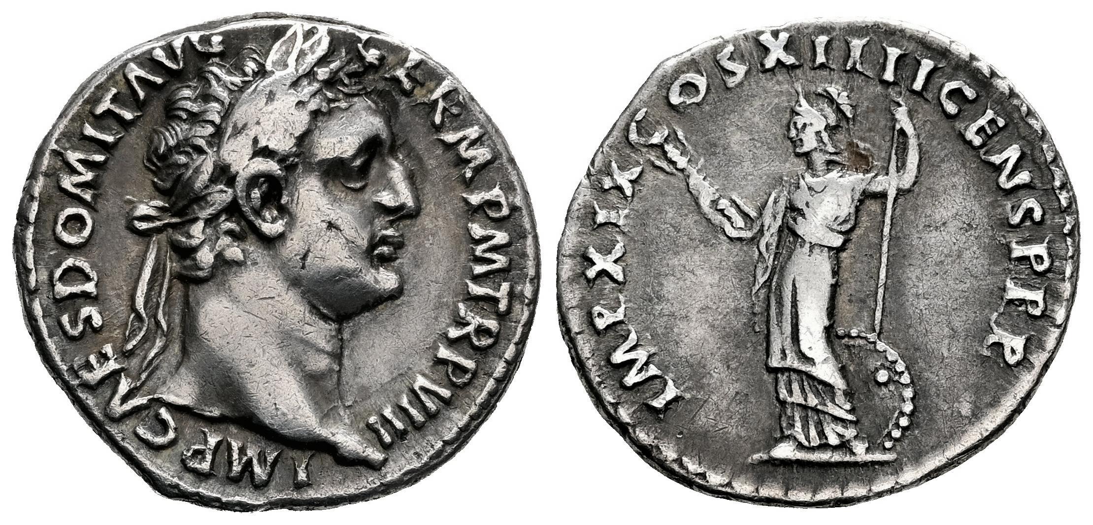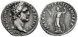 Domiciano. Denario. 88-89 d.C. Roma. (Ric-II 1 670). (Bmcre-154). (Rsc-250). Anv.: IMP CAES DOMIT AVG GERM P M TR P VIII. Cabeza laureada a la derecha. Rev.: IMP XIX COS XIIII CENS P P P. Minerva en pie a la izquierda, sosteniendo una lanza apoyada en el suelo. Ag. 3,37 g. Ligero tono. MBC. Est...160,00.