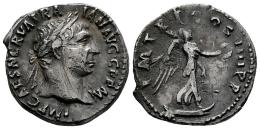 Trajano. Denario. 102 d.C. Roma. (Ric-II 59). (Woytek-123b). (Bmcre-106). Anv.: IMP CAES NERVA TRAIAN AVG GERM. Cabeza laureada a la derecha, drapeado en el hombro más alejado. Rev.: P M TR P COS IIII P P. Victoria en pie a la derecha sobre una proa terminada en una serpiente, sosteniendo corona y palma. Ag. 3,20 g. Golpes. MBC-. Est...80,00.