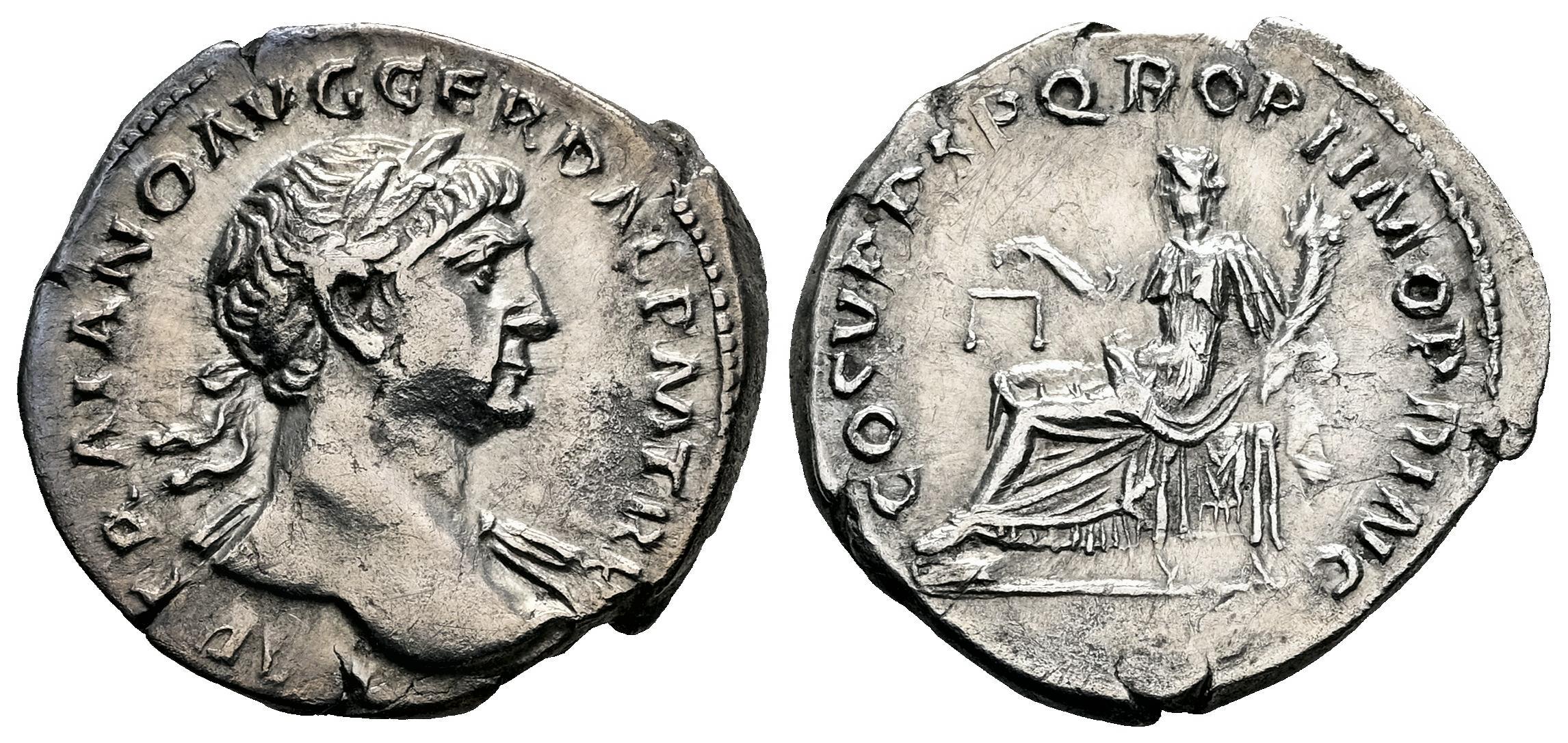 Trajano. Denario. 103-111 d.C. Roma. (Ric-II 119). (Woytek-279b). (Bmcre-288). Anv.: IMP TRAIANO AVG GER DAC P M TR P. Busto laureado a la derecha, ligero drapeado en el hombro opuesto. Rev.: COS V P P S P Q R OPTIMO PRINC. Aequitas sedente a la izquierda, sosteniendo balanzas y cornucopias. Ag. 3,13 g. Ligero tono. MBC+. Est...90,00.