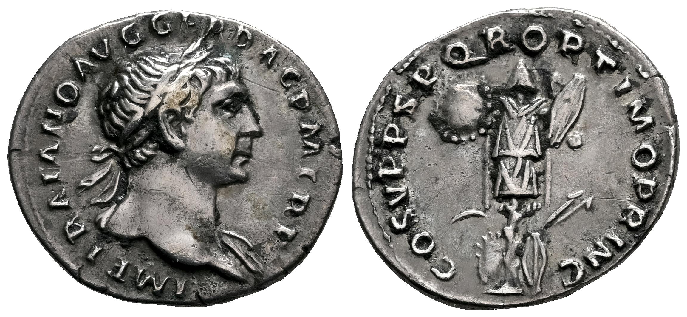 Trajano. Denario. 107-108 d.C. Roma. (Ric-II 147b). (Woytek-268b). (Bmcre-359/63). Anv.: IMP TRAIANO AVG GER DAC P M TR P. Cabeza laureada a la derecha, ligero drapeado en el hombro opuesto. Rev.: COS V P P S P Q R OPTIMO PRINC. Trofeo con un escudo redondo y dos hexagonales; espada, dos jabalinas y dos escudos en la base. Ag. 3,19 g. Ligera pátina. MBC+. Est...200,00.