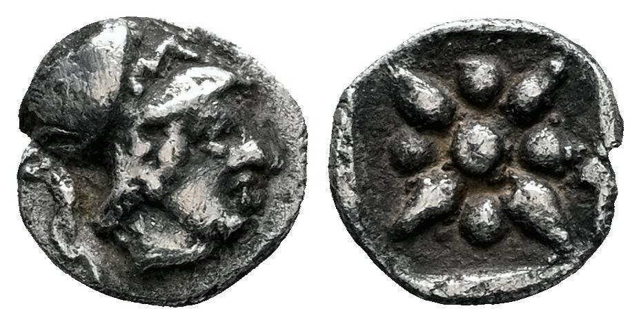 Troas. Kolone. Hemióbolo. Siglo V a.C. Anv.: Cabeza de Atenea a la derecha, con casco corintio con cresta. Rev.: Estrella de ocho rayos intercalada con cuatro puntos; todo dentro de un punzón cuadrado incuso poco profundo. Ag. 0,35 g. Extremadamente rara, aparentemente inédita. Similar Roma Numismatics 110, lote 429. MBC. Est...100,00.