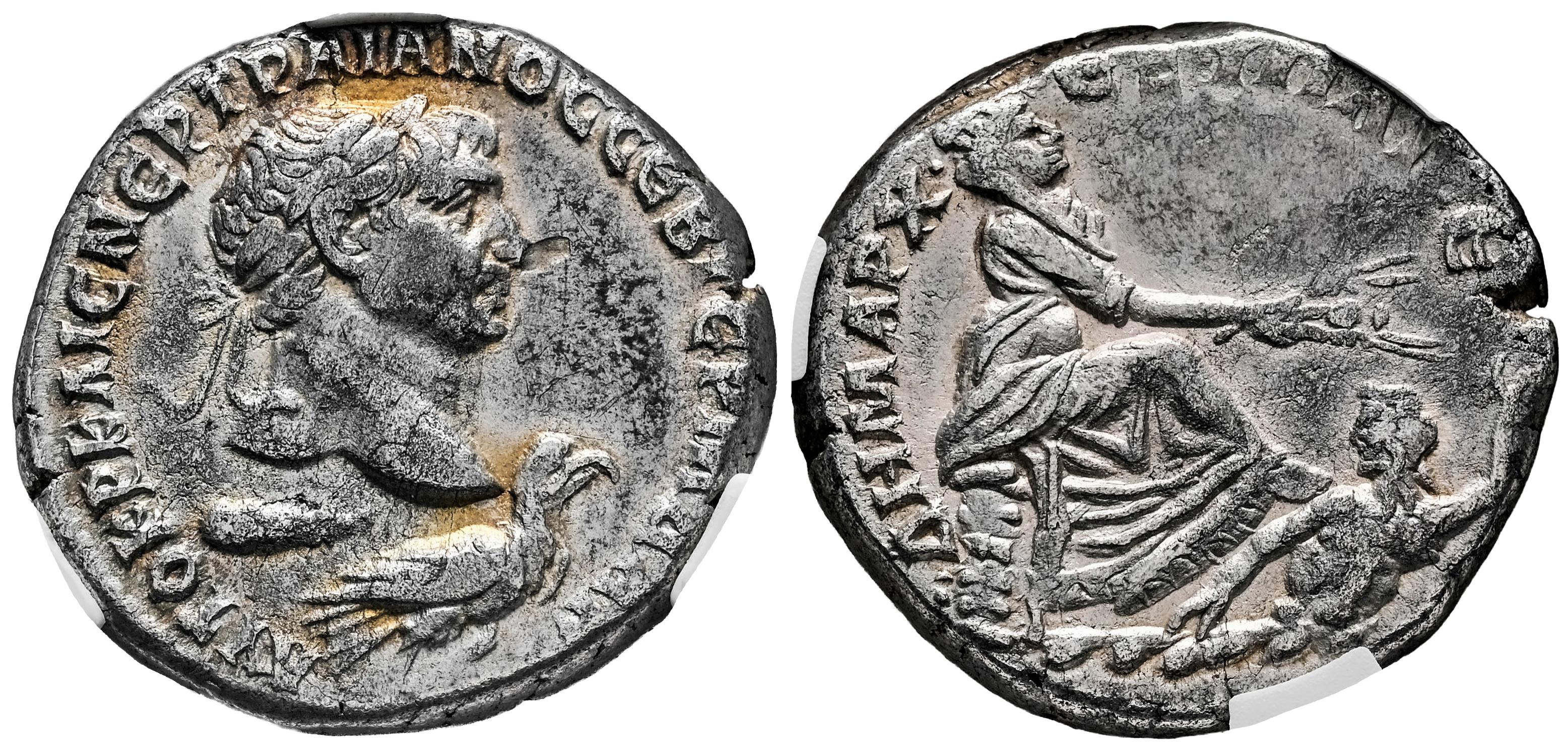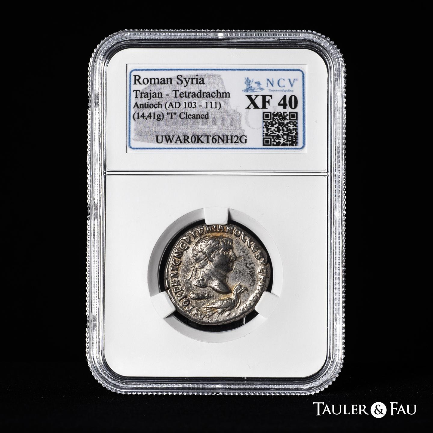Trajano. Seleucis y Pieria. Tetradracma. 110-111 d.C. Antioquía. (RPC-III 3540). (Prieur-1498). (McAlee-470). Anv.: AYTOKP KAIC NЄP TPAIANOC CЄB ГЄPM ΔAK. Cabeza laureada a la derecha, colocada sobre un águila en pie a la derecha; Clava en el campo izquierdo debajo. Rev.: ΔHMAPX ΄Ξ IЄ YΠAT Є. Tyche de Antioquía sedente a la derecha sobre rocas, sosteniendo dos espigas y una amapola; a sus pies, el dios del río Orontes nadando a la derecha, con la cabeza a la izquierda. Ag. 14,41 g. Ligero tono en anverso. Bella. Ex Cgb.fr E-Shop 737942. Encapsulada por NCV como XF 40. Cleaned. NCV-XF. Est...400,00.