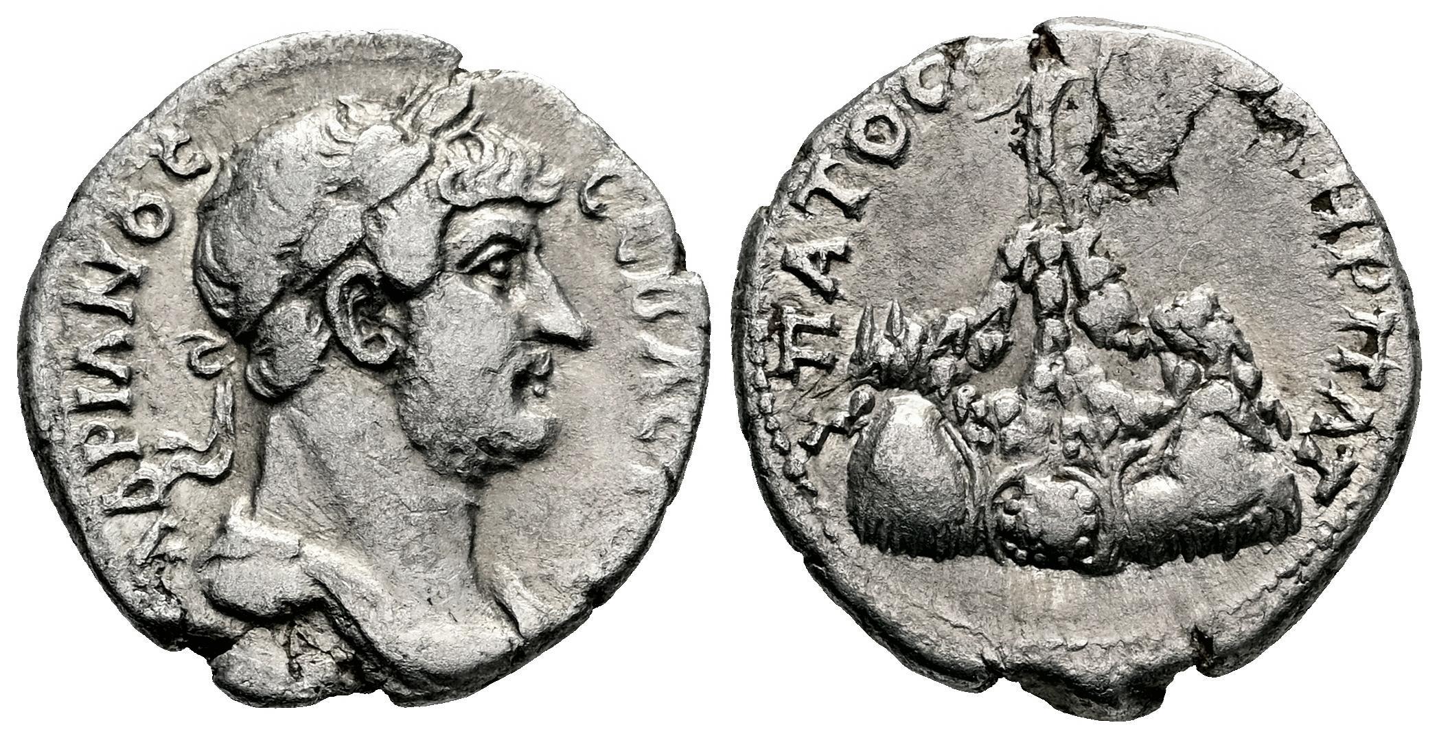 Adriano. Dracma. 128-138 d.C. Caesarea-Eusebia. Capadocia. (Ganschow-184f). (Sydenham-Caesarea Suppl., 263b). Anv.: ΑΔΡΙΑΝΟϹ ϹЄΒΑϹΤΟϹ. Busto laureado y drapeado a la derecha. Rev.: ΥΠΑΤΟC [Γ ΠΑΤ]ΗΡ ΠΑΤ. Monte Argaios coronado por una estatua de Sol-Helios, radiado, sosteniendo un globo en su mano derecha y un largo cetro en su izquierda. Ag. 6,49 g. Ex Leu Numismatik 26, Colección Eric ten Brink (08/07/2023), lote 2689. Est...120,00.