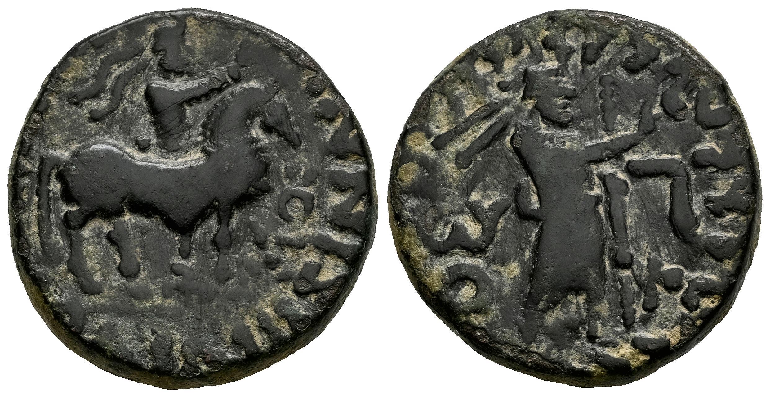 Indoescitas. Gondophares-Sases. Tetradracma. 19/20-46 d.C. Gandhara. (Senior-242.46T/242.601T). Anv.: Rey a caballo a la derecha, llevando cataphractus y sosteniendo un látigo en alto; letra Karosthi tamgha delante del caballo, leyenda griega alrededor. Rev.: Zeus en pie a la derecha, sosteniendo un cetro; signo triratna detrás, va en Kharosthi a la derecha; escritura Karoshthi alrededor. Ve. 10,04 g. MBC-. Est...70,00.