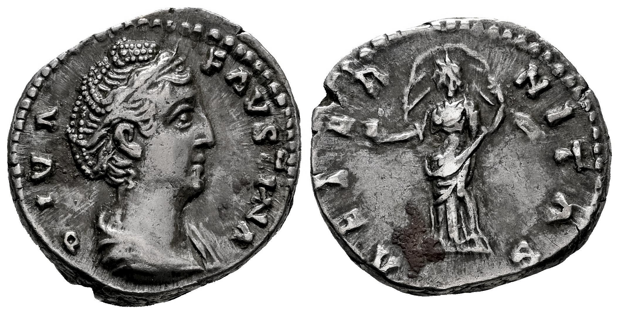 Diva Faustina. Denario. 141 d.C. Roma. (Ric-III 347). (Bmcre-354). (Rsc-11). Anv.: DIVA FAVSTINA. Busto drapeado a la derecha. Rev.: AETERNITAS Aeternitas en pie de frente, mirando hacia la izquierda, sosteniendo un fénix con halo y levantando sus ropajes. Ag. 3,42 g. Leves depósitos en reverso. MBC. Est...90,00.