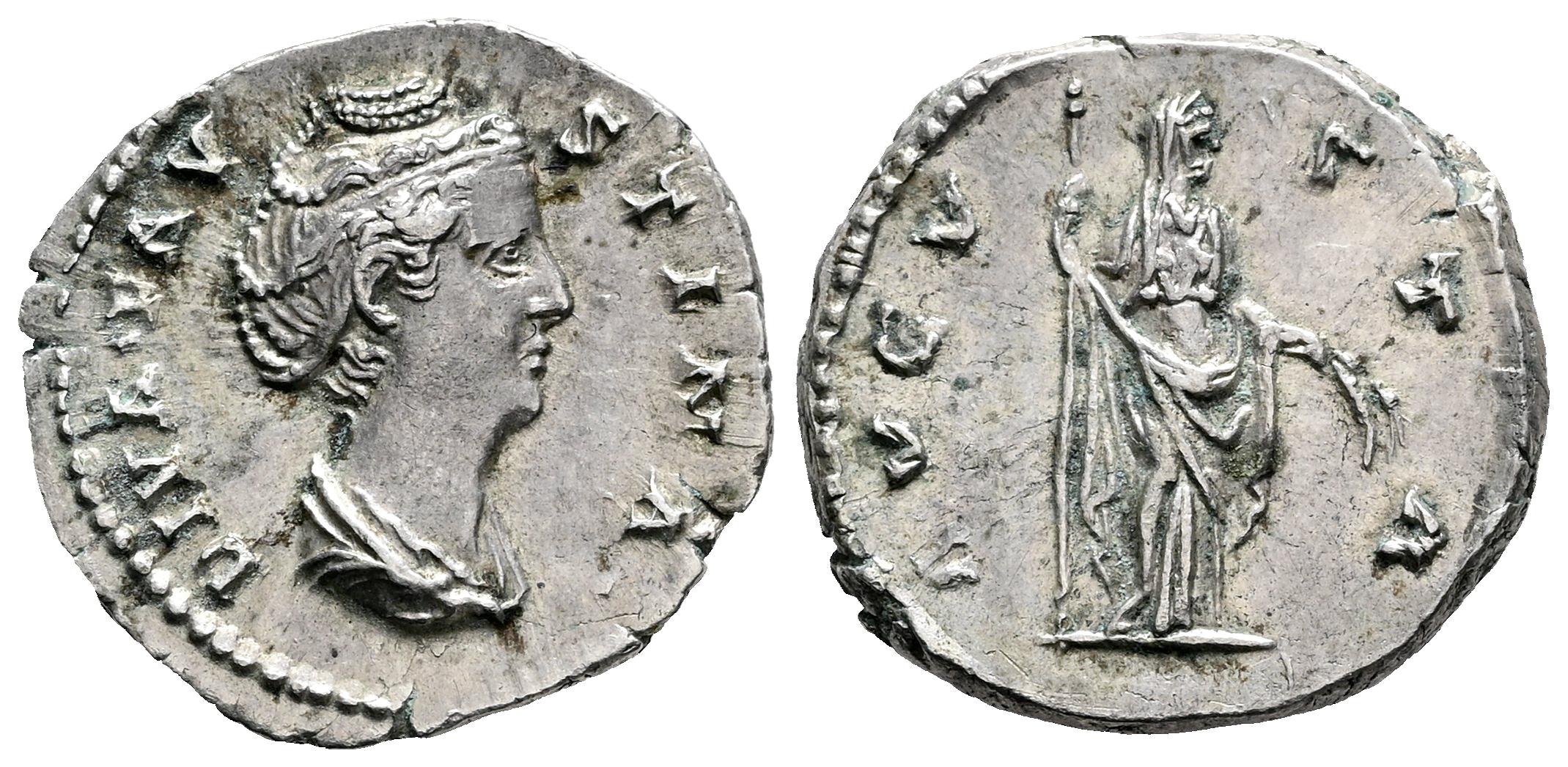 Diva Faustina. Denario. 141 d.C. Roma. (Ric-III 358). (Bmcre-389/94). (Rsc-93). Anv.: DIVA FAVSTINA. Busto drapeado a la derecha. Rev.: AVGVSTA. Ceres de pie de frente,mirando a la derecha, sosteniendo cetro y espigas. Ag. 3,15 g. Leves restos de verdín. Buena acuñación. EBC-. Est...80,00.