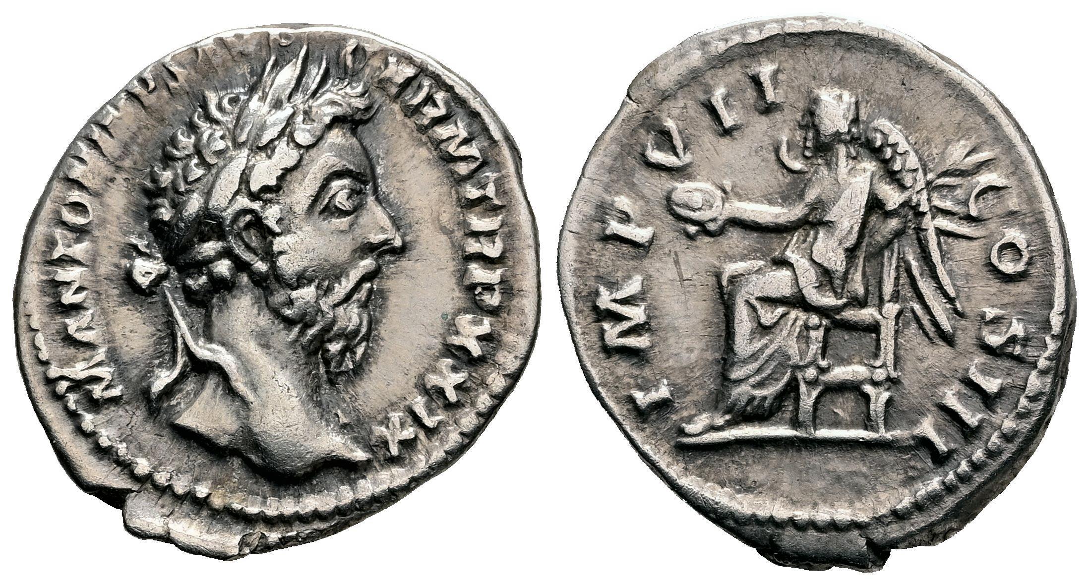 Marco Aurelio. Denario. 174-175 d.C. Roma. (Ric-III 312). (Rsc-327). Anv.: M ANTONINVS AVG TR P XXIX. Cabeza laureada a la derecha. Rev.: IMP VII COS III. Victoria sedente a la izquierda, sosteniendo pátera y palma. Ag. 3,21 g. MBC. Est...85,00.