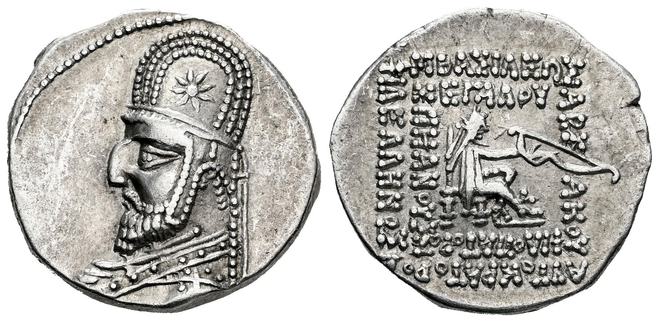 Imperio Parto. Mithradates III. Dracma. 87-79 a.C. Ekbatana. (Sellwood-31.5 (Orodes I)). (Shore-122 (Orodes I)). Anv.: Busto a la izquierda, con tiara decorada con estrella de ocho puntas. Rev.: ΒΑΣΙΛΕΩΣ ΠEΓAΛOY AIΣKOY ΕΠIΦΑΝΟΥΣ ΦIΛΛHNOΣ AVTOKPATOPOΣ ΦIΛOΠATOPOΣ. Arquero (Arsakes I) sedente a la derecha sobre trono, portando un arco. Ag. EBC-. Est...120,00.